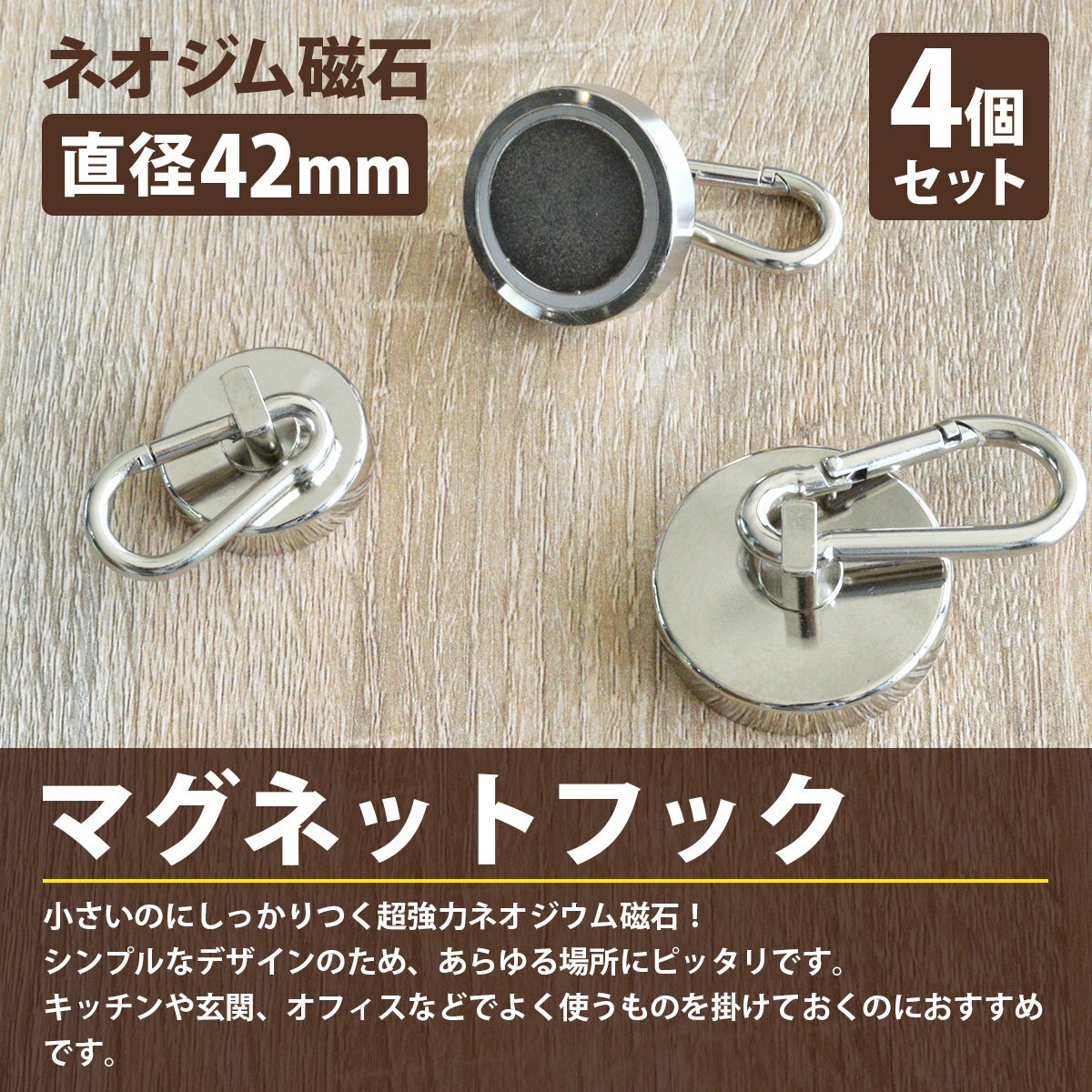 【送料250円】『4個set 直径42mm』カラビナ マグネットフック 超強力 マグネット ネオジム 磁石 フック 防錆 ステンレス製 耐荷重68KG