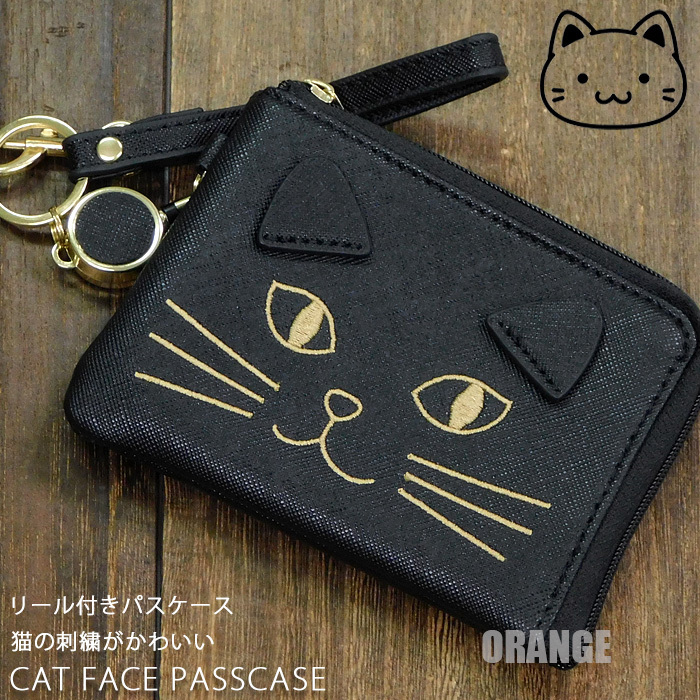 送料無料 猫 ネコ フェイス刺繍 リール付き パスケース レディース キッズ カードケース 定期入れ 小銭入れ コインケース 猫グッズ 黒■