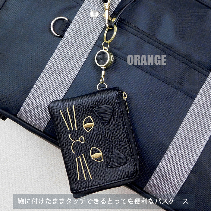 リール付き キャットフェイス刺繍パスケース