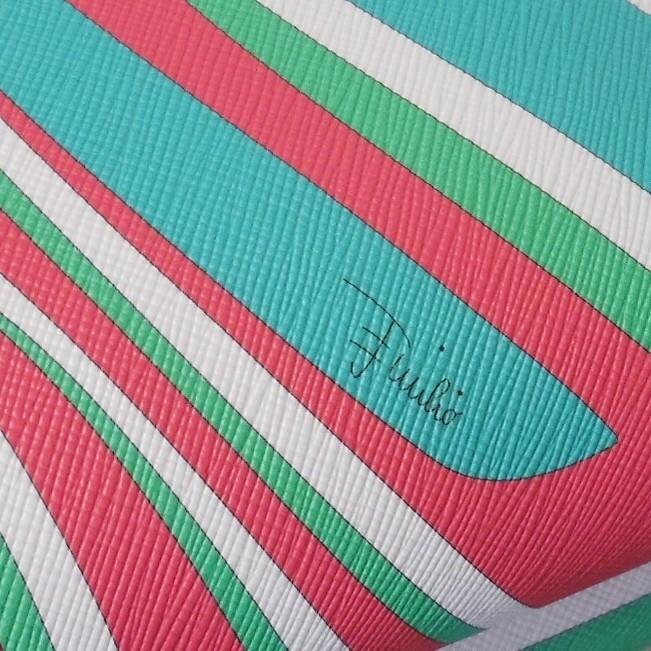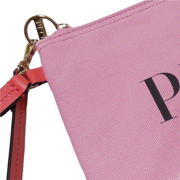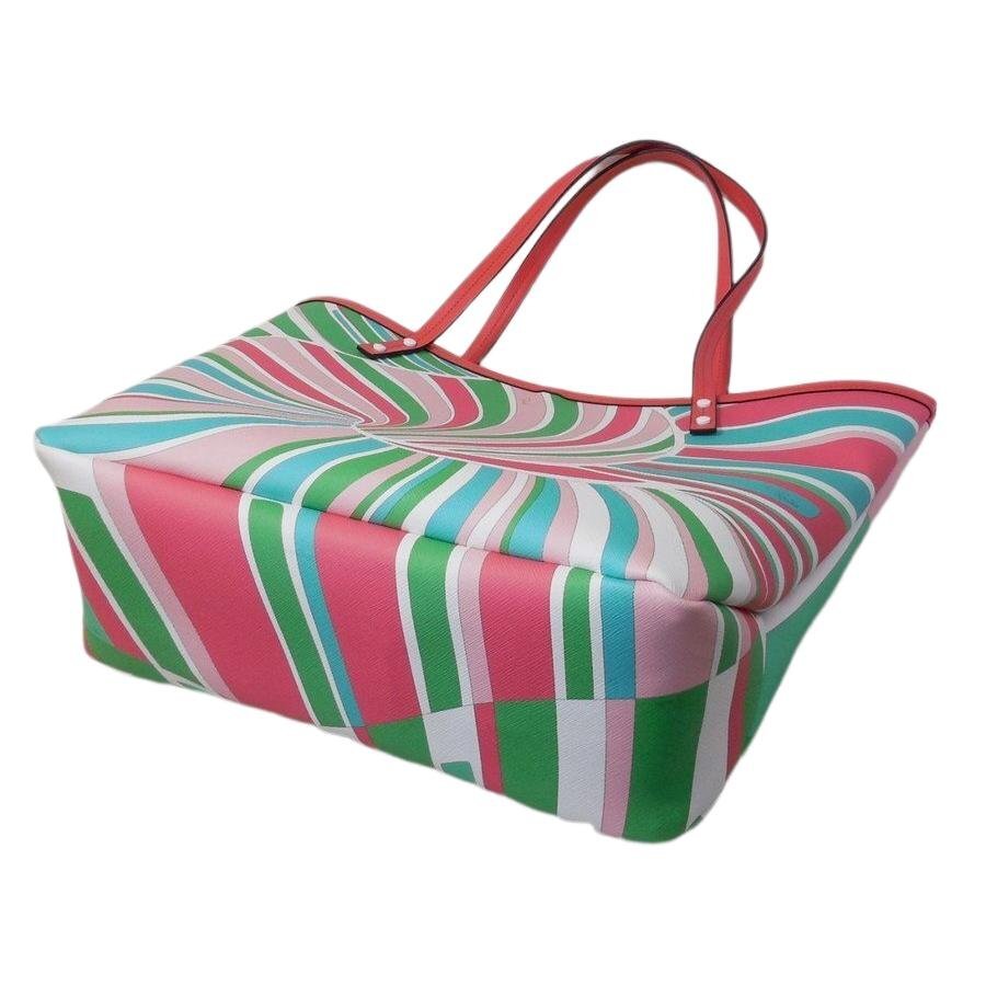 | 素材、カラー | 表地は合成皮革(アクリル55%、ポリエチレン30%、コットン15%)、裏地はコットン100%、トリミングとハンドルはカーフレザー80% コットン20%、カラーはピンク系マルチカラー、金色の金具 |
