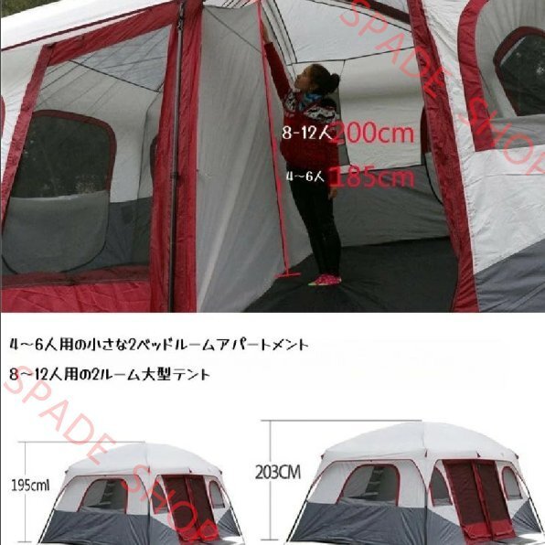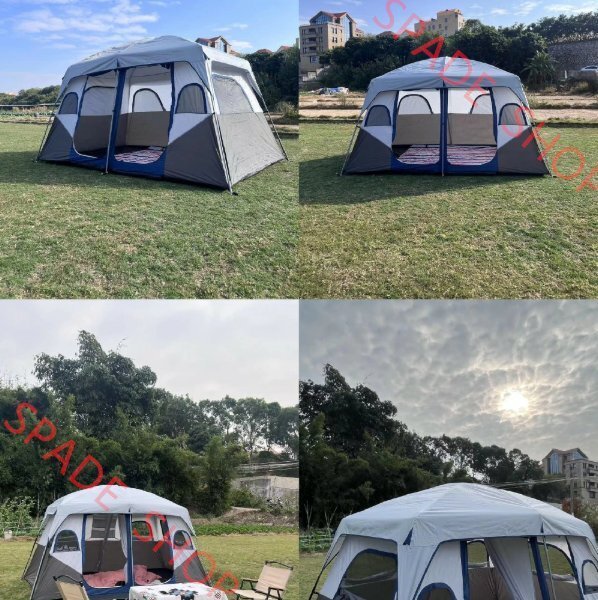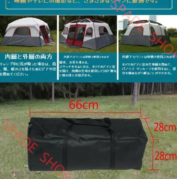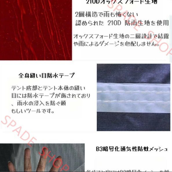 | 商品の色:青色 対応人数:4~6 人が収容可能 当社の屋外キャンプテントは洗練された換気システムを誇り、寒い冬は快適に、夏は涼しく保ちます。ルームとリビング装備大空間あり、4-6人収容可能快適な居住空間を楽しめながら、椅子、テーブルなどを並べて余裕なリビングスペースも確保できます。までの天井の高さあり、テント内に窮屈なしゆったり動き回します。 シームレスなスチールポールを特徴とする当社の屋外キャンプテントは、あらゆる面から完全な照明を確保しながら、しっかりと雨や日差しから守ります。 インナーテントの前面、左右出入り、後ろ風窓は全てメッシュ面装備二重層構造、 天井までもメッシュスクリーンタイプ、蚊虫入りにくい、通気性&開放感良い、 夏の強い日差しの眩しを軽減し、心地良いひかりを取り入れ、テント内に快適に すごせます。 広々とした豪華な家族の隠れ家を提供する屋外キャンプテントをご紹介します。正面シートをボールで支えると、開放感よい天幕として利用可能、日陰やレジャー空間が広がり、ゆったりとした荷物置き場、BBQ、食事など家族とのくつろげる空間としても利用可能。 商品の説明商品の説明ファミリー、グループキャンプに活躍できる2ルームとリビングが備わり大型キャノピーテントです。 天井の高さは200cmまで、テント内に窮屈なしゆったり立てます。 テントシートは耐水圧3000mm防水性能高いオックスフォードを使い、雨の日にも安心です。 フライシート付きフルークローズ可能、プライバシー保護で就寝中安心です。 開放感よい前室を設け、直射日光を遮断しながら、家族とのくつろげる空間として活用できます。 正面と左右側出入り口にメッシュ面付き、出入り楽々ながら、真夏に風通し良くて涼しいです。 商品詳細商品名:リビングと2ルーム付きキャノピーテント 内帳材質:150Dオックスフォード+高密度メッシュ(耐水圧3000mm PU加工) 外帳材質:150Dオックスフォード(耐水圧3000mm PU加工) 底面材質:耐磨耗性高いポリエチレン(PE)(耐水圧3000mm ) フレーム材質:黒塗装したスチール製ボール+グラスファイバー 付属品:テント本体 フライシート 寝室仕切り用シート 組立用テントポール ペグ ロープ キャリアバック |