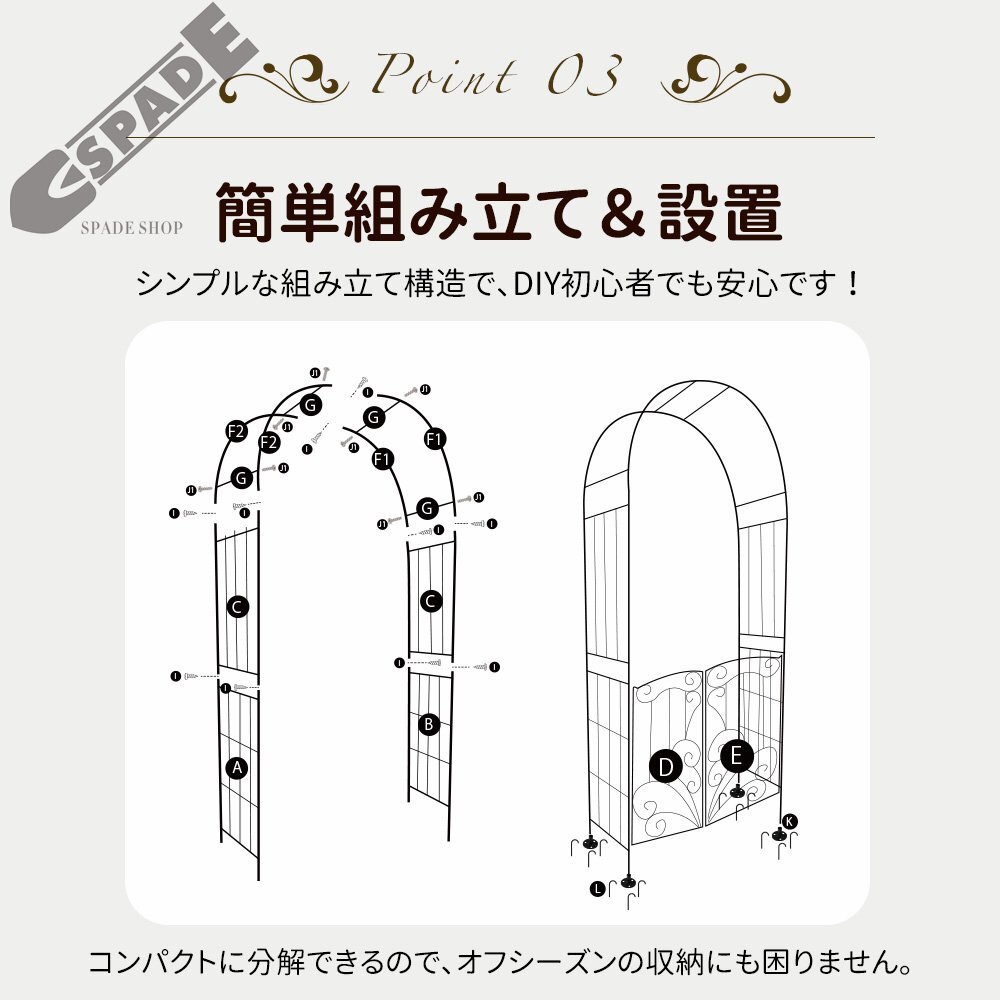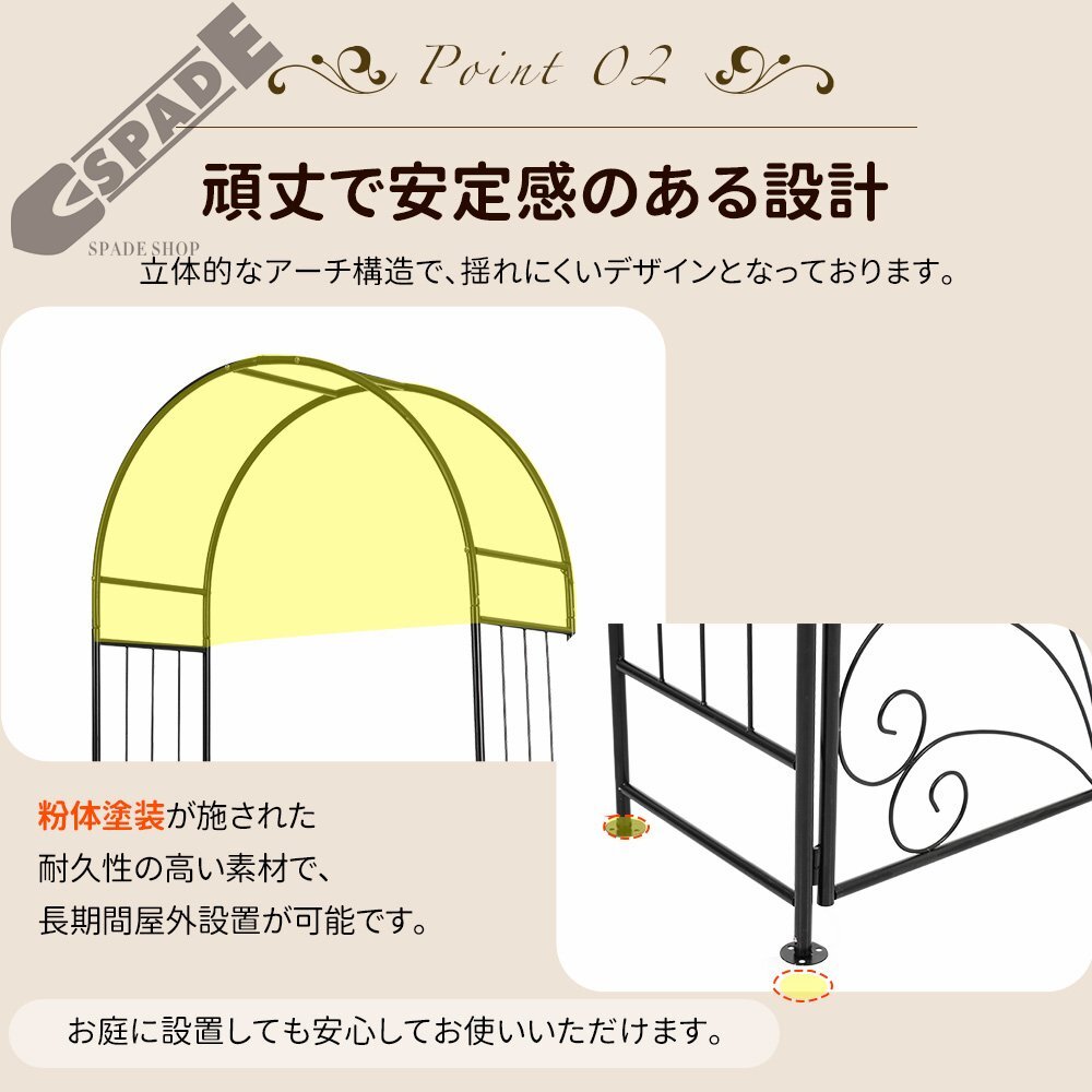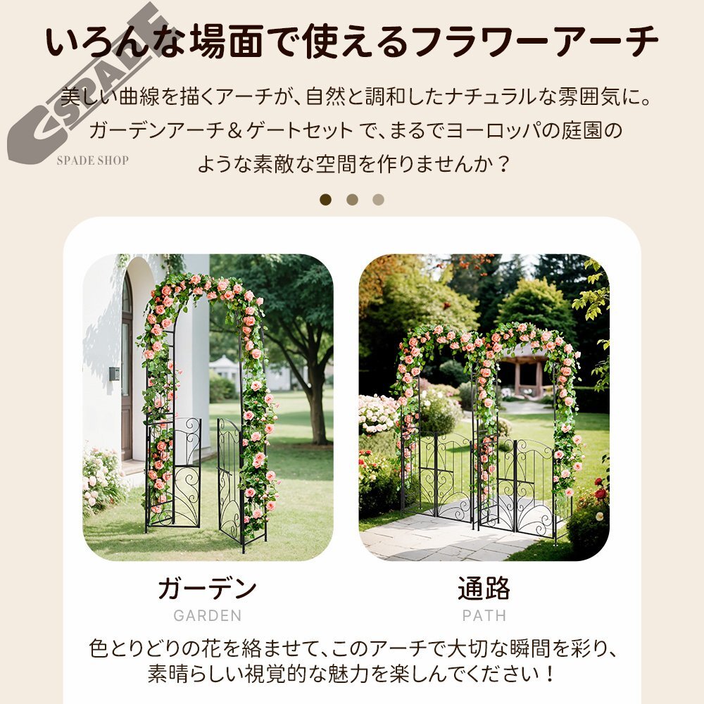 • ◎02 エレガントなアーチデザイン 美しい曲線を描くアーチが、自然と調和したナチュラルな雰囲気に。ガーデンアーチ&ゲートセット で、まるでヨーロッパの庭園のような素敵な空間を作りませんか?色とりどりの花を絡ませて、このアーチで大切な瞬間を彩り、素晴らしい視覚的な魅力を楽しんでください!