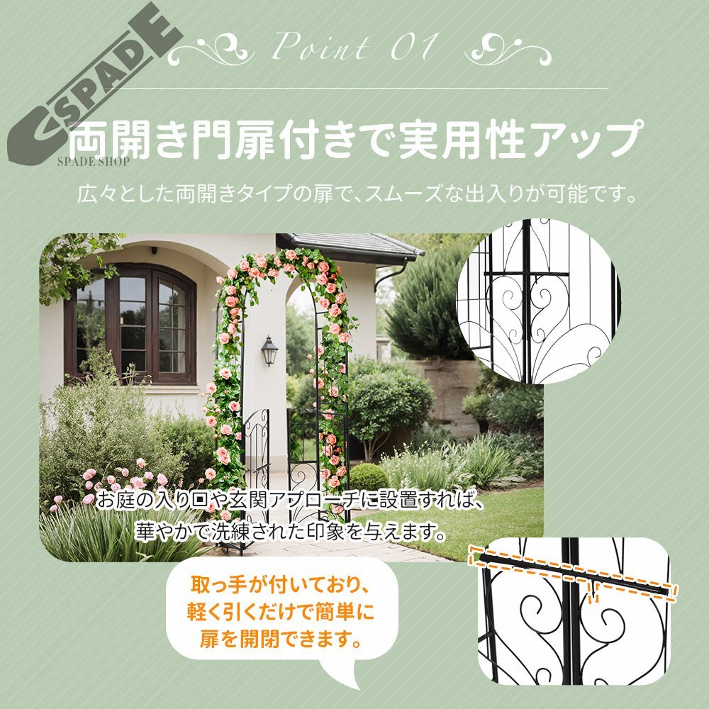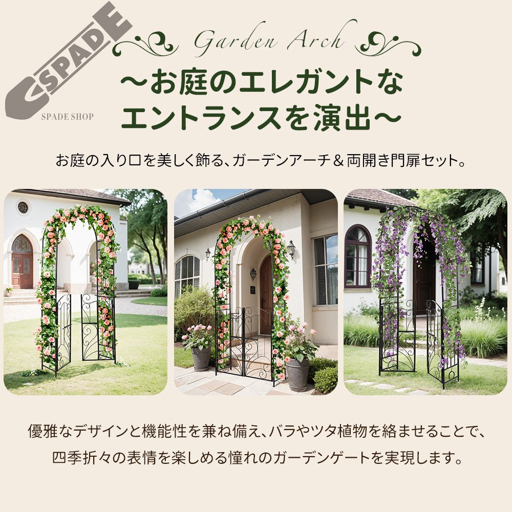 • ◎01~お庭のエレガントなエントランスを演出~お庭の入り口を美しく飾る、ガーデンアーチ&両開き門扉セット。優雅なデザインと機能性を兼ね備え、バラやツタ植物を絡ませることで、四季折々の表情を楽しめる憧れのガーデンゲートを実現します。