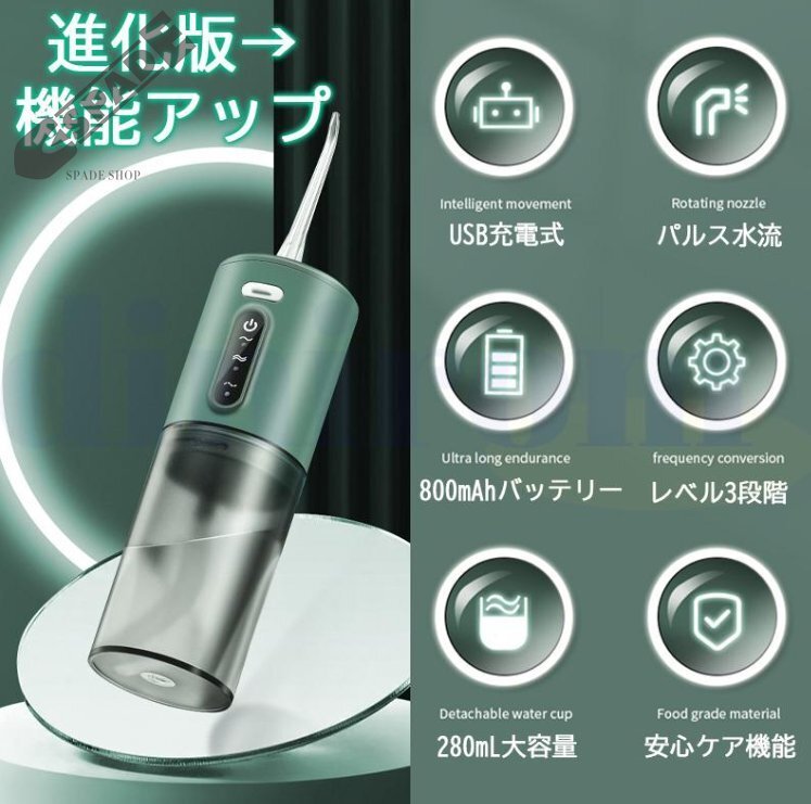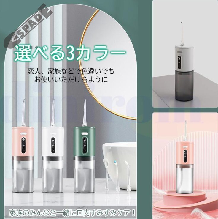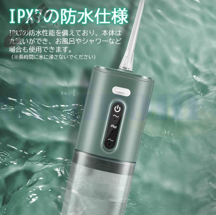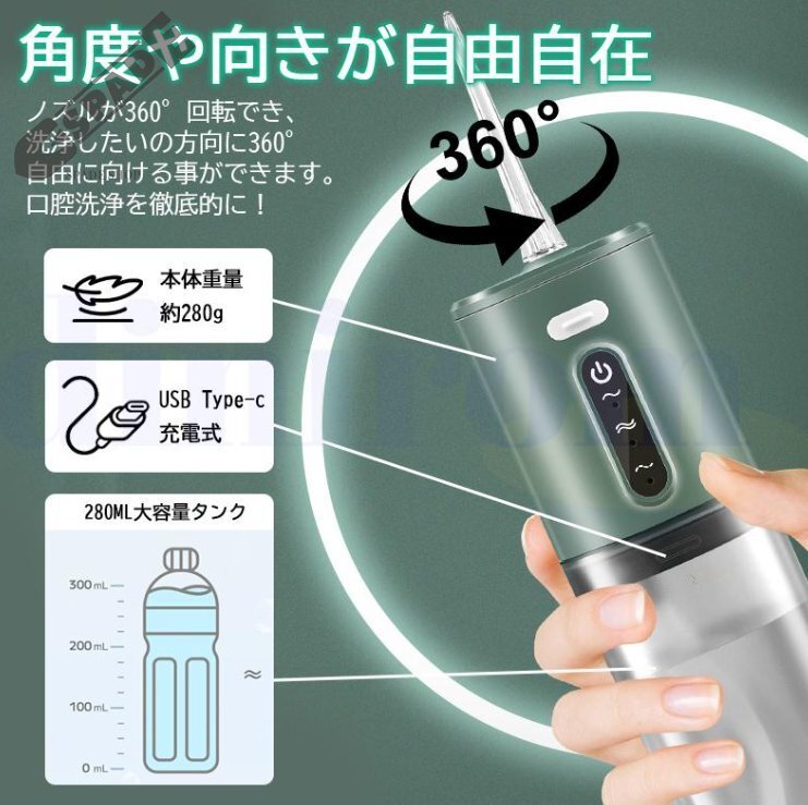 | IPX7防水設計・大容量水タンク | ジェットウォッシャーはIPX7防水設計を搭載され、洗面所やお風呂など湿気が多い場所でも使用できます。さらに、ジェットウォッシャーは280mLタンクを満タンにすることで約1分間の連続洗浄が可能です。一回のご利用で満足いっぱいです。この口腔洗浄器は水タンクの継ぎ目にはゴムパッキンがあり、水漏れを防止します。。水タンクは取り外しやすい設計なので、内部の水垢を気軽に掃除できます。ウォーターピックは日常生活に大きな利便性をもたらし、幸福感をもたらす! |