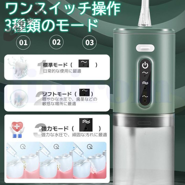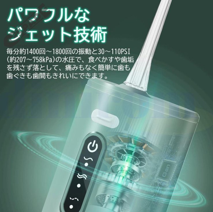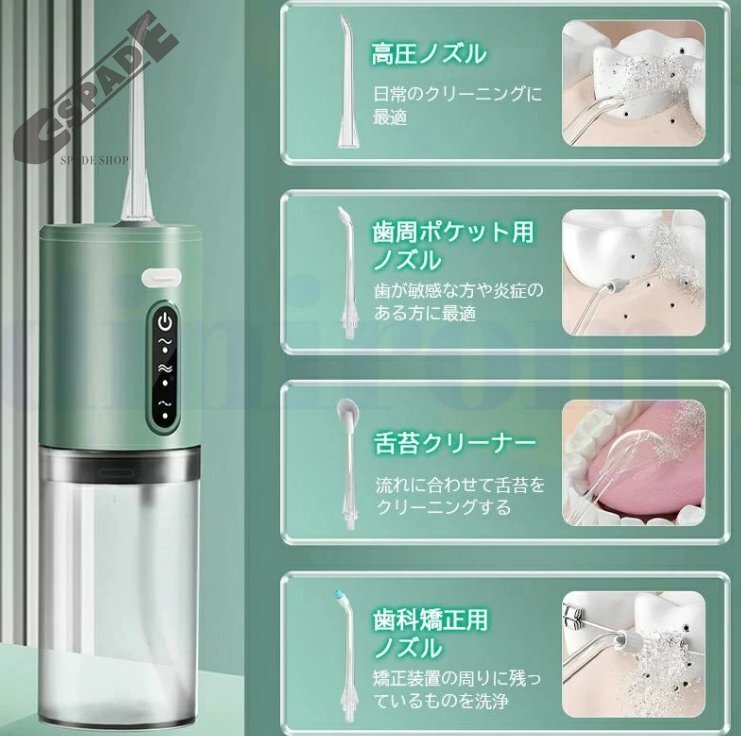 | 3種類水流モード・5種の替えノズル | このジェットウォッシャーは歯茎の状態に応じて 水流が調整できます。3種類水流モードは「ソフトモード・パワーモード・パルスモード」初心者でも素早く使えます。ウォーターピックのさまざまなモードは口内の汚れや食物残渣をしっかりと除去し、水圧強弱を交互に噴射して洗浄効果もいっぱいです。口腔洗浄器は替えノズル5本が付属されて、スタンダードノズル2本、舌用ノズル1本、歯垢除去用ノズル1本、歯矯正用ノズル1本があります。異なるノズルは普段洗浄しにくい歯垢を除去します。(ご注意:初心者、歯茎が弱い方はソフトモードをお勧めします。) |