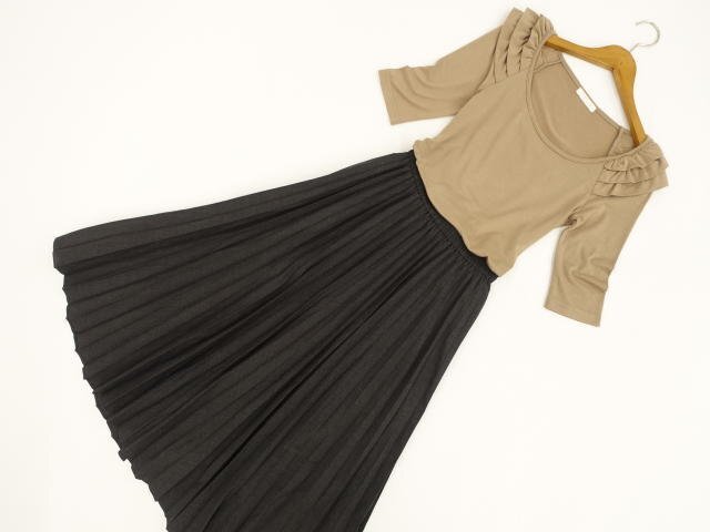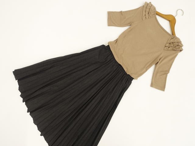 洗える五分袖カットソー+ロング丈プリーツスカート コーディネート上下2点セット S相当 ブラウン系/ダークグレー系 カジュアル・シンプル系 20代・30代~