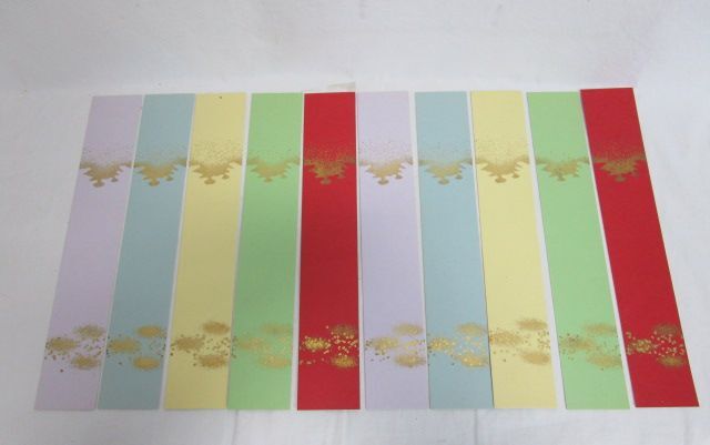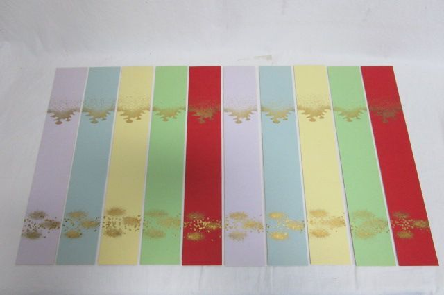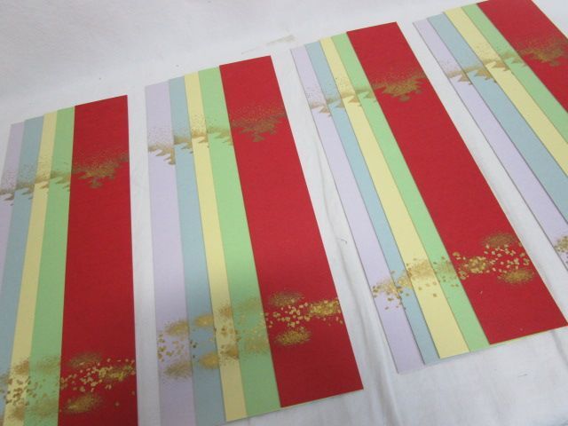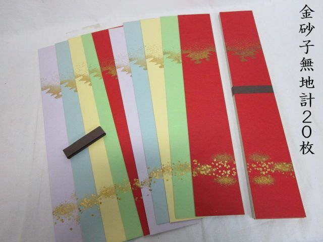 金砂子 短冊 計20枚です。 赤、緑、黄色、青、紫の計5色になっています。 表面はきれいですが、裏面にヤケやシミあり。 破れや折れはありません。 長期保存品なので、ご了承ください。 やや厚めで硬めの短冊です。 表面の状態は★★良好★★です。 ※多少の古さや使用感、小さなシミ、シワ、角折れ等々・・・ 古さ特有の経年劣化が気になるようでしたら、ご入札を差し控えて頂くか、 早めのご質問にて、ご理解・ご了承お願い致します。 ※パソコンやスマホなどご覧いただく環境によって、色合いや素材など現品と 異なる場合がございますので、ご注意ください。 |
