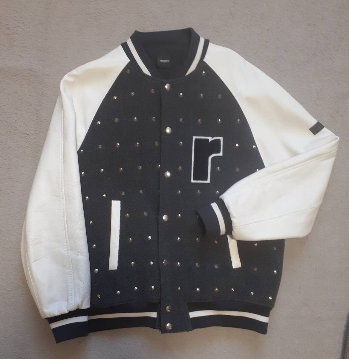 レノマのダークグレーとホワイトのスタジャンです。