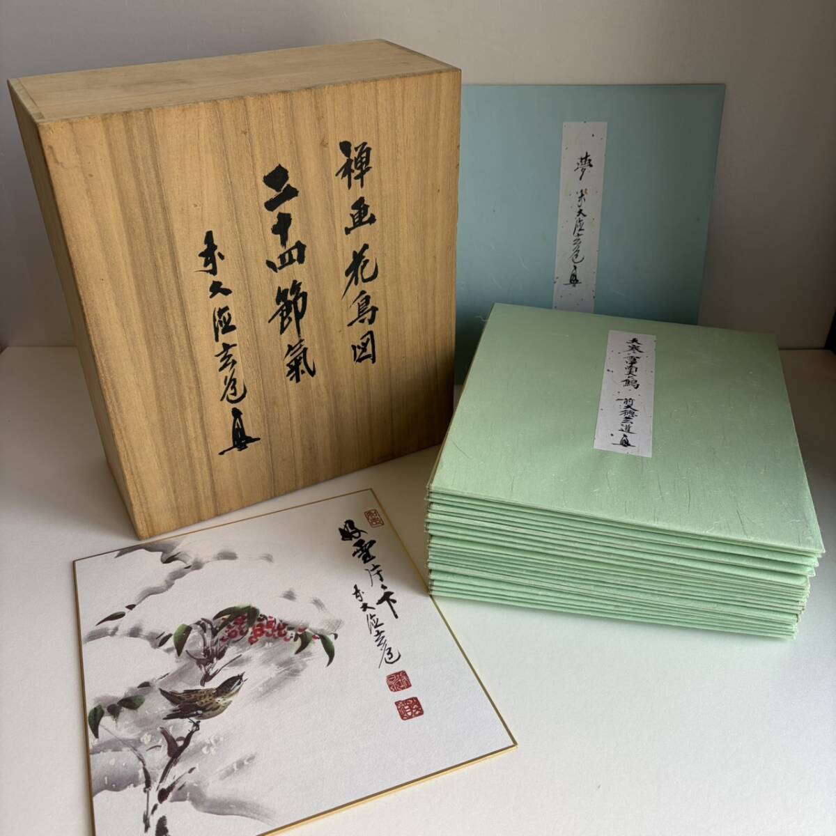 【送料無料】前大徳寺 須賀玄道 印刷工芸 禅画花鳥図 二十四節季 色絵色紙揃い 二十四枚+「夢」一枚(計25枚) 木箱付