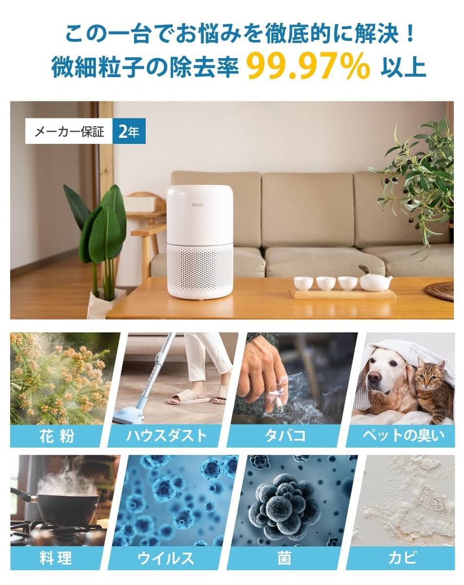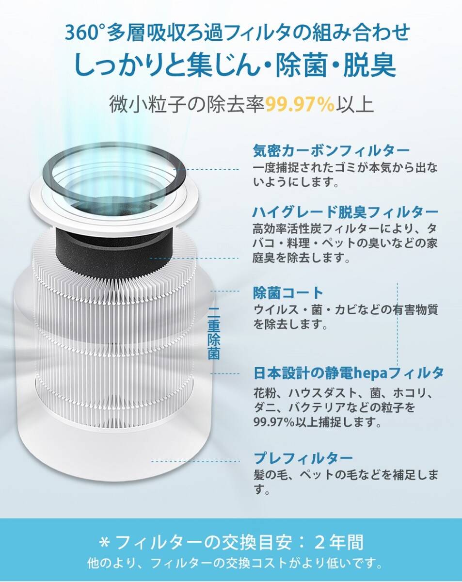 【5層ろ過・2層除菌で、空気の悩みから解放! 】ウイルス・菌・ホコリ・カビ・アレルゲン・PM2.5・たばこ・ペット臭・抜け毛除去を重視した、一体型高性能フィルターを採用しています。0.1μmの微粒子の除去率は99.97%まで、除菌率はさらに99.99%に登ります。くしゃみ、鼻水、鼻のかゆみなどの症状を緩和し、より安心で快適な毎日を過ごしていただけます。同じフィルターを2年以上ご使用になると空気の汚れは取れませんし、嫌な臭い、さらには健康に悪影響を及ぼすおそれもあるのです。