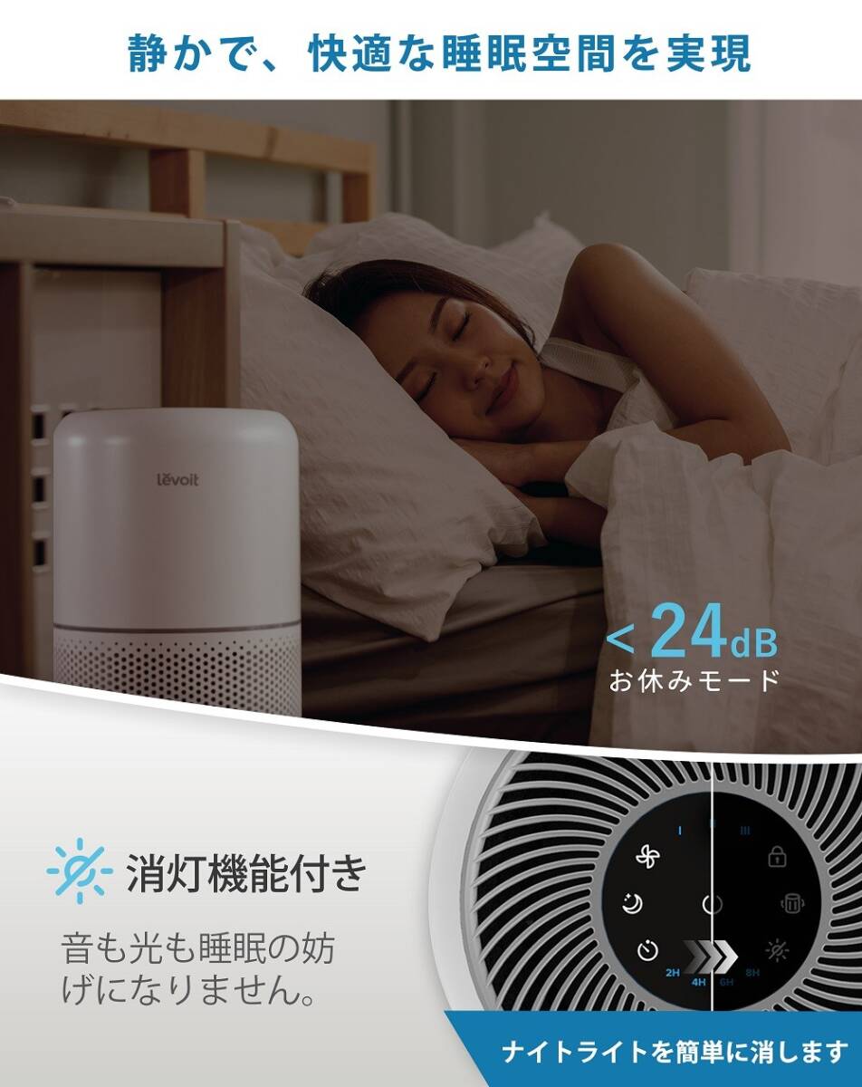 【静かで省エネ、つけっぱなしでも大丈夫! 】特許取得済みのサイレントテクノロジーと特殊の風道設計で運転音を24dBに低減し、同時に、画面表示オフ機能も搭載されているので、光に敏感な方でももぐっすり眠れます。静音の上におやすみモードの電気代は1時間たったの0.25円ですので、つけっぱなしにしても気になりません。