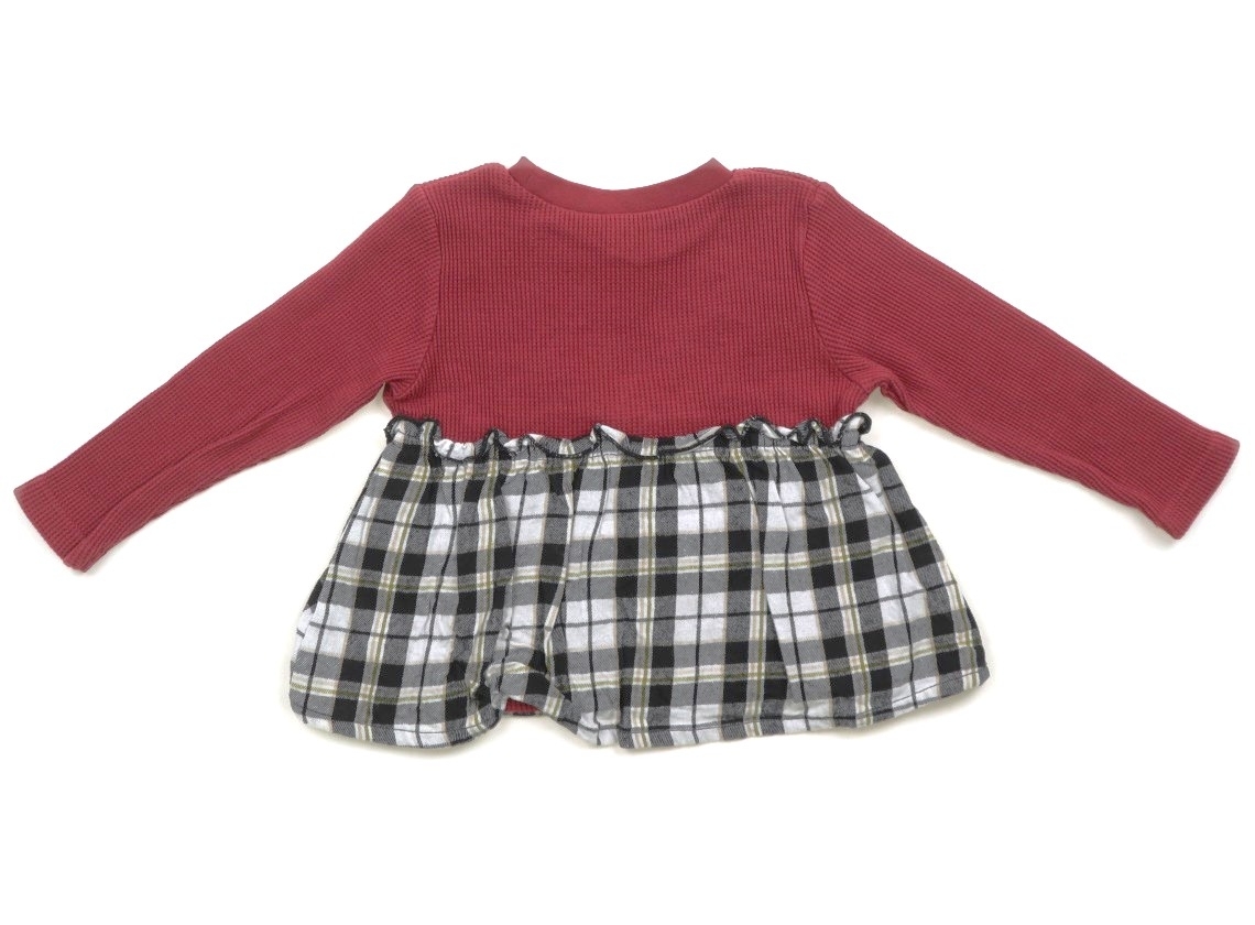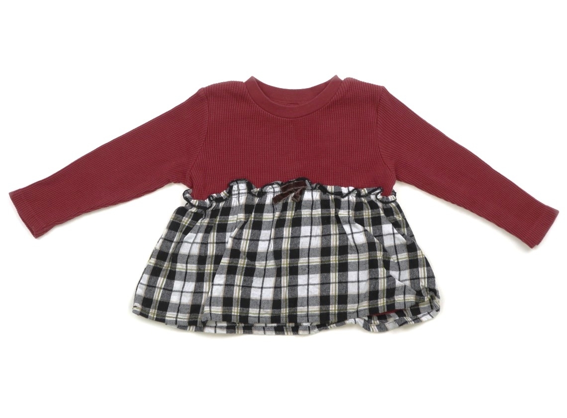 ワッフルカットソーにフランネルチェックのチュニック合体デザイン。リボンはベロア生地です。リボンにヨレ、全体に毛羽立ち、ワッフル地にやや色褪せが見られます。