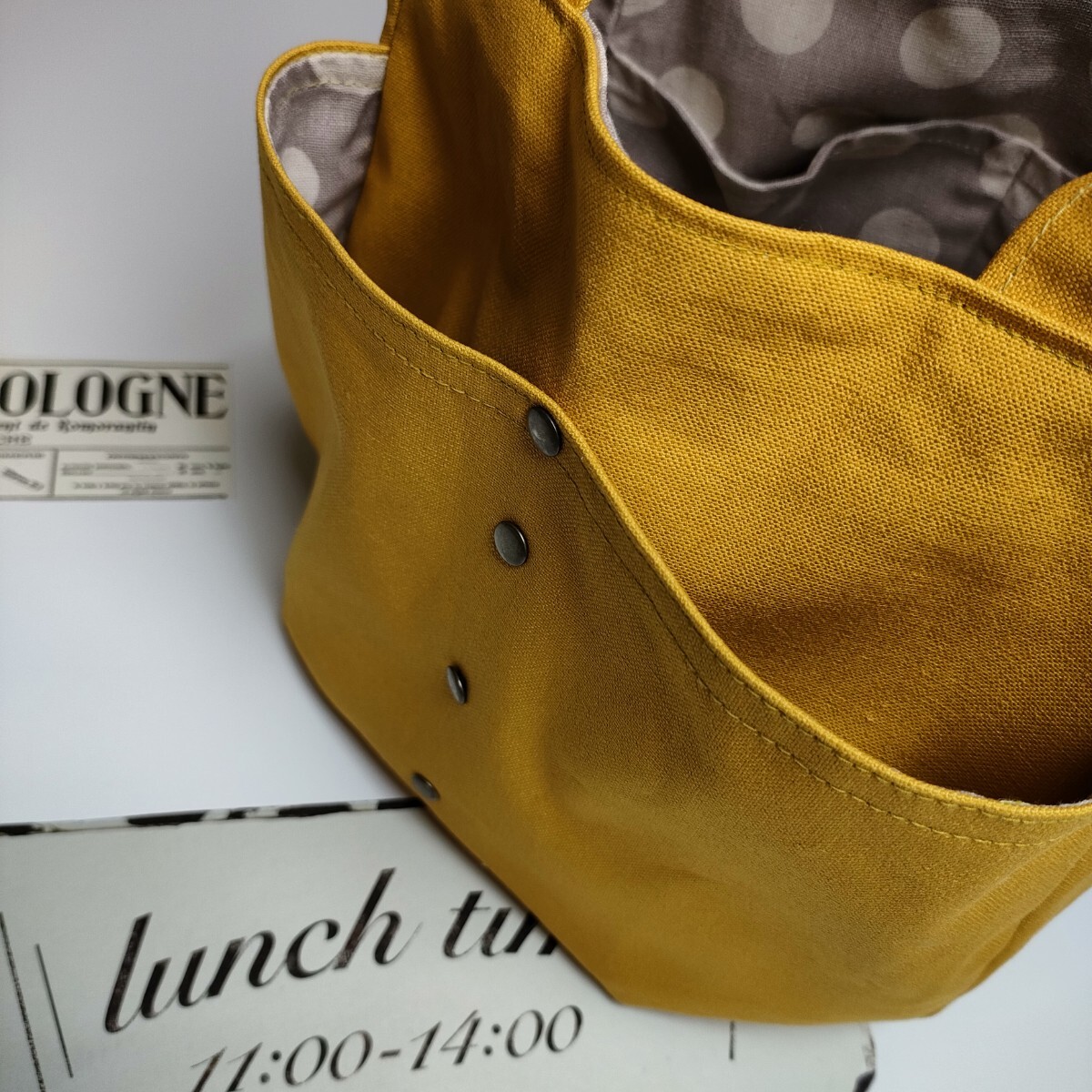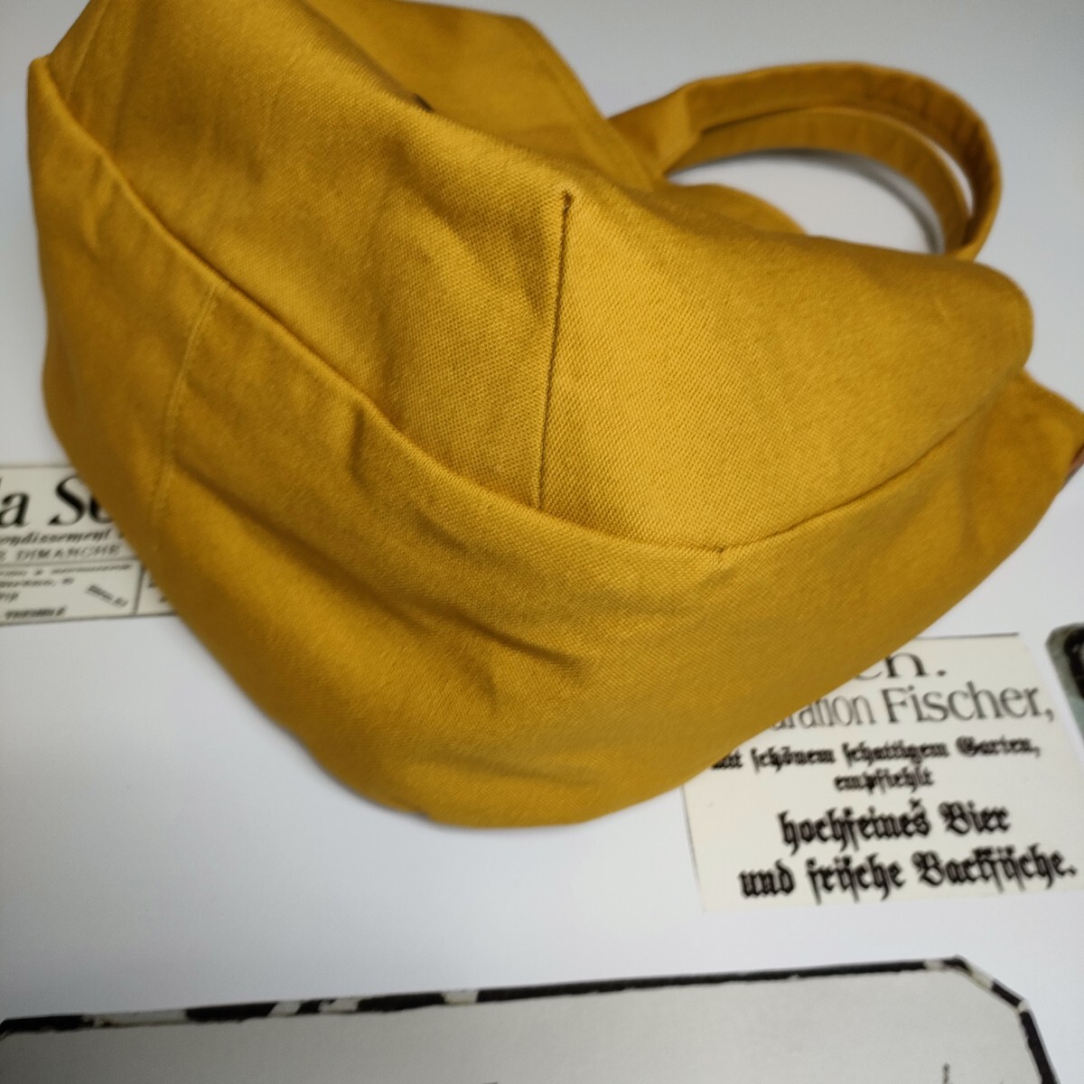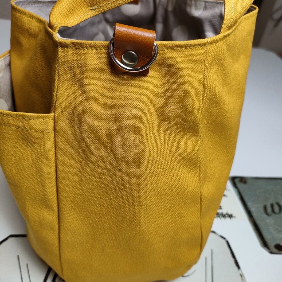 | 沢山の品の中から、ご覧いただきありがとうございます。 お店には売っていない、ハンドメイドの温かさをお届け出来ましたら幸いです。 マリーゴールドみたいな山吹色の11号帆布で、ぷっくりとしたバッグを作りました。コーデネイトの差し色になるような綺麗な山吹色です。 ♪サイズ 深さ・・・約22 横・・・ペタンと置いて入り口位置で29 マチ・・・9〜11 持ち手・・・26 ♪素材 表・・・11号帆布(コットン100)カシメ、Dカン、本革のタグ 内側・・・コットンリネンキャンバス しっかりとした帆布で、自立するバッグになっています。ダーツでぷっくりとした2部屋のポケットが、小物の収納に便利です。 Dカンをつけましたので、お手持ちの肩紐でショルダーや斜め掛けにもなります(画像の肩紐は出品していません) 内側は、水玉模様のコットンリネンキャンバスで。2部屋のポケットを付けました。 毎日の小物や、バッグを製作しています。 どうぞよろしくお願いいたします。 ★リネン、コットンは天然素材ならではのネップ、スラブ等ございます。 ★雨、汗、摩擦などで、色落ちする場合がございます。 ★生地の色、厚さに合わせなるべく糸を変えアイロンをこまめに掛けながら、職業用ミシンで丁寧に製作しています。 | |||