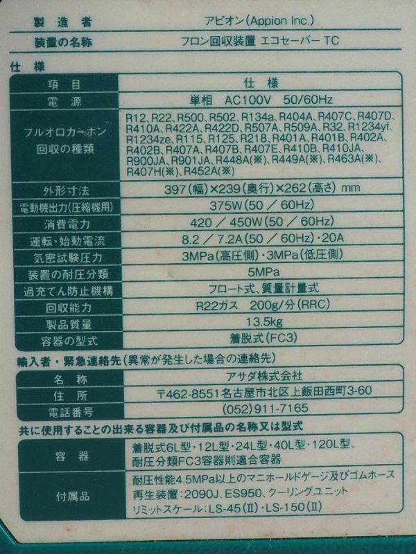 n3T251122Y ASADA アサダ アピオン フロン回収装置 エコセーバーTC 通電/起動確認済み エアコン 冷蔵庫 ガス回収 現状品