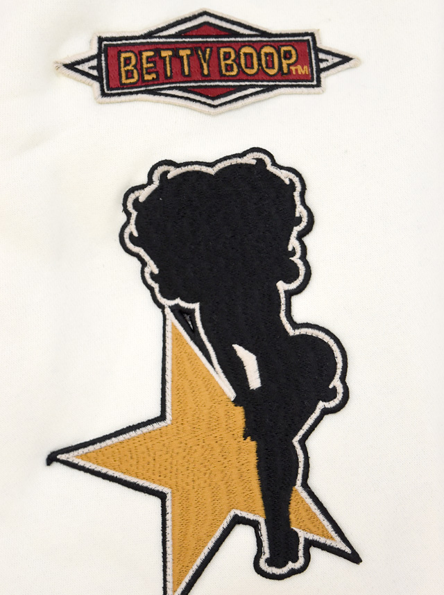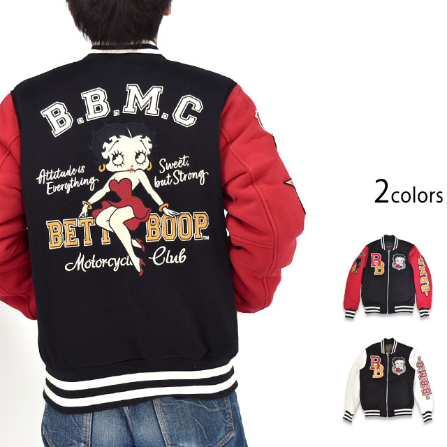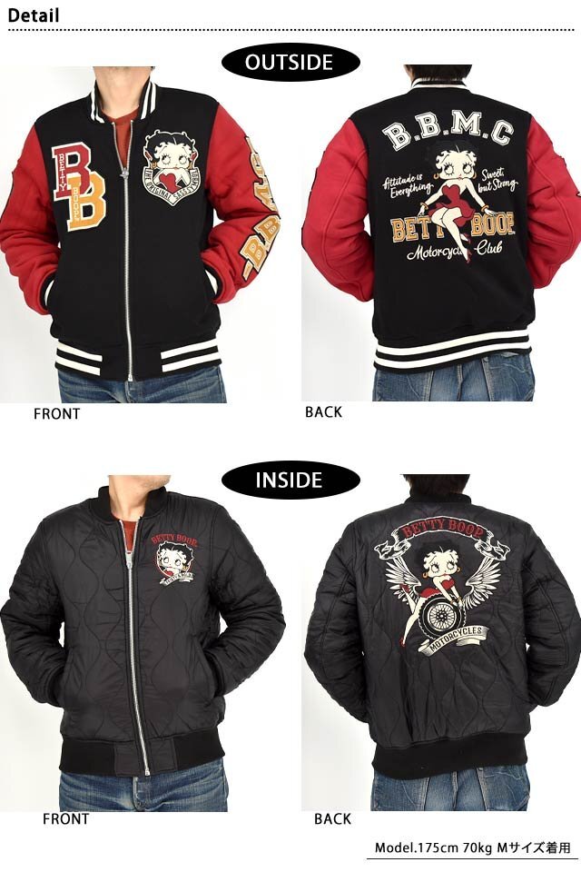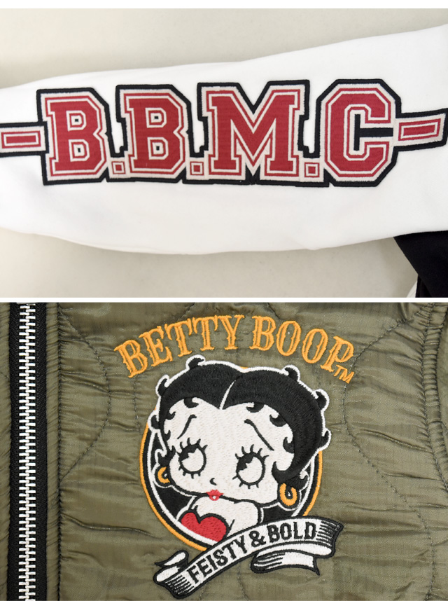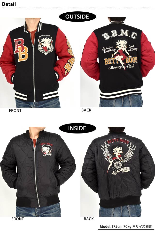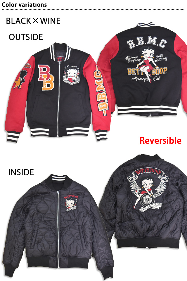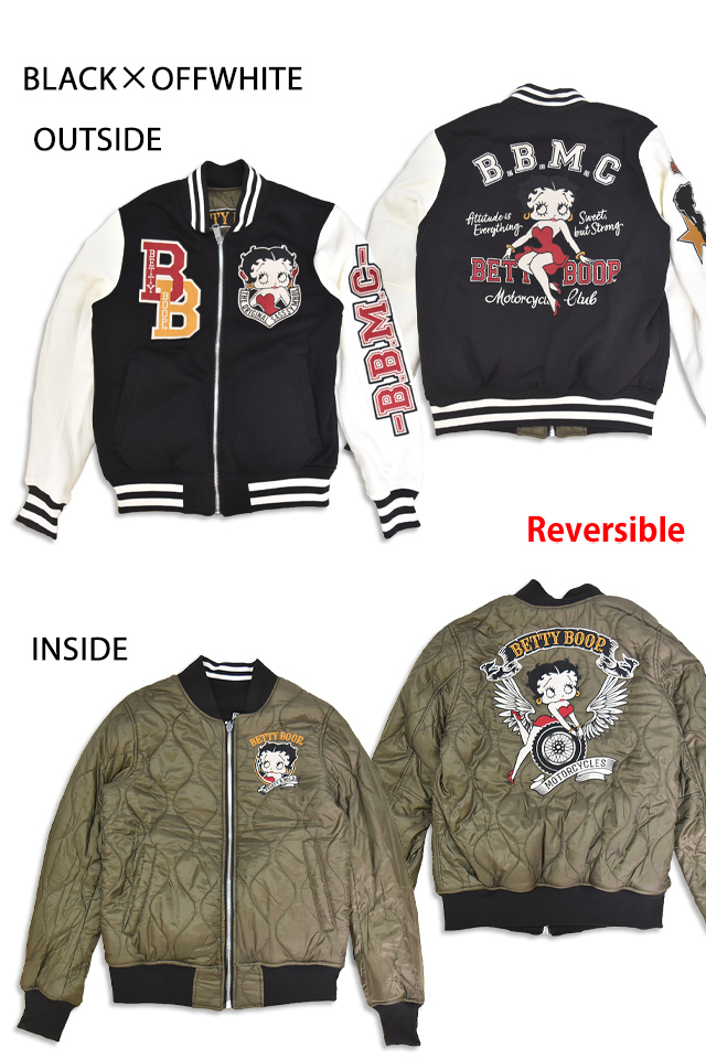 BETTY×ネバーマインド リバーシブルスタジャン(BBN-2529)のご紹介です。 大きな瞳とぽってりした赤い唇が印象的な女の子、ベティ・ブープ(Betty Boop)。 今回はリバーシブル仕様のアウターが登場しました! 表面は、ボディーに弾力のあるふかふかのボンディング生地を採用したスタジャンです。 裏面にはキルティングブルゾンを採用。 こちらもしっかりと絵柄が入っておりますので、一着で二着分の着こなしをお楽しみいただける、贅沢なジャケットです。 フロントはジップアップ仕様。 | |||||||||||||||||||||||||