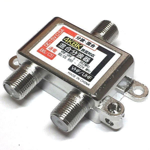 | 詳細 | ・4K8K対応 ・CS/BS端子通電 ・使用帯域:VHF/UHF 5-862MHz BS/CS 950-3224MHz ・VHF/UHF, BS/CS 混合分波器(屋内用) ※BS・CSの混合、分波はできません。 VHF/UHFとBS/CSの混合・分波器となります。 ・入力:F型端子 / 出力:F型端子 ・ UHF・VHF / BS・CS端子⇔BS・CS端子間電流通過 |