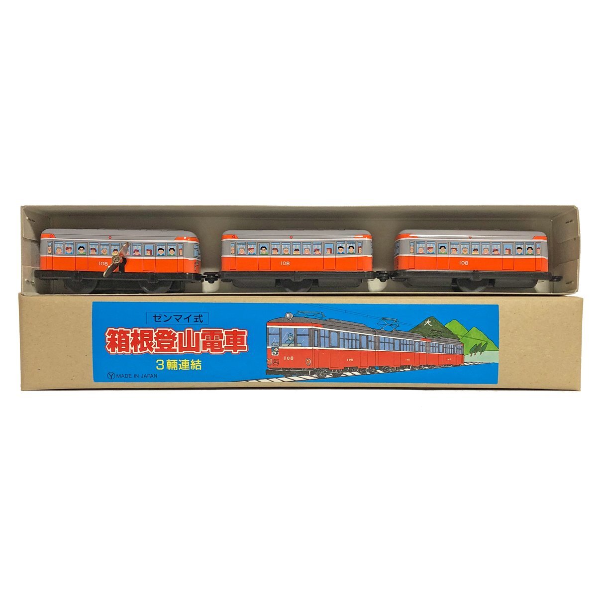 詳細説明 三幸製作所 ゼンマイ式箱根登山列車3両連結モデル。化粧箱入りです。
