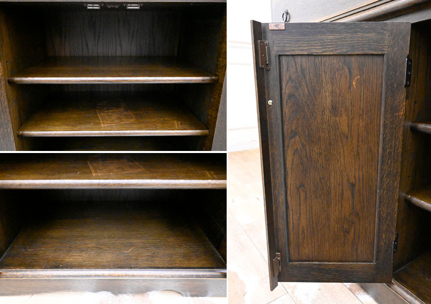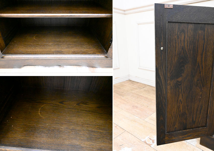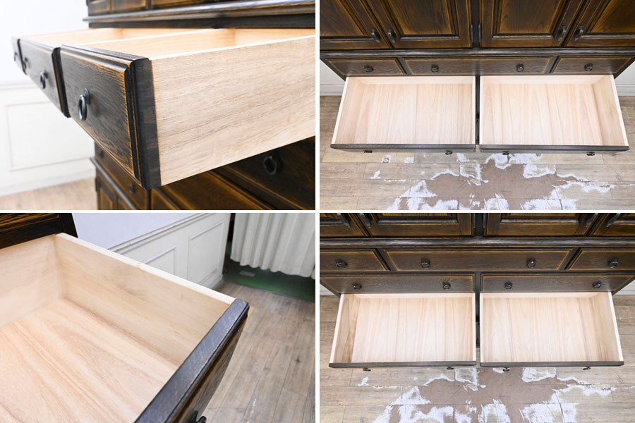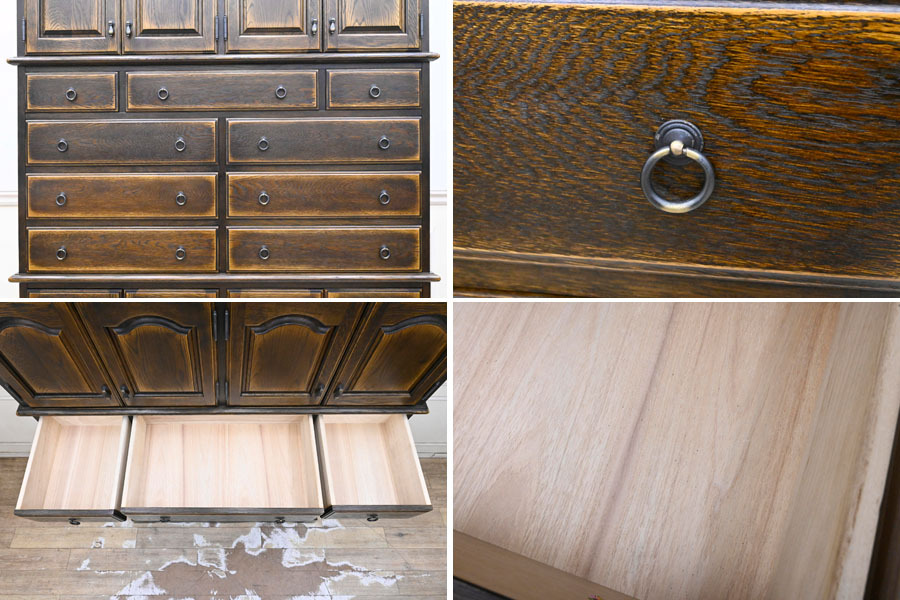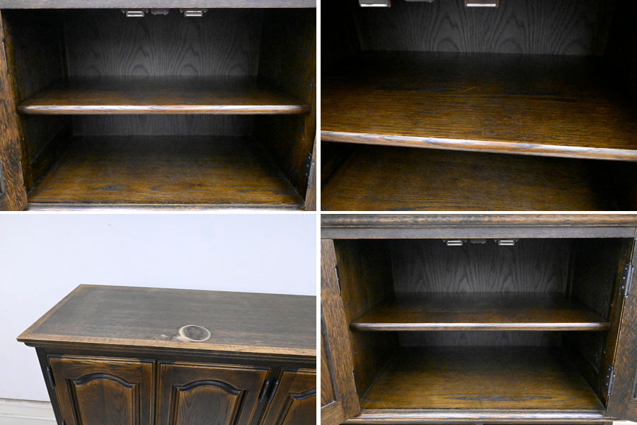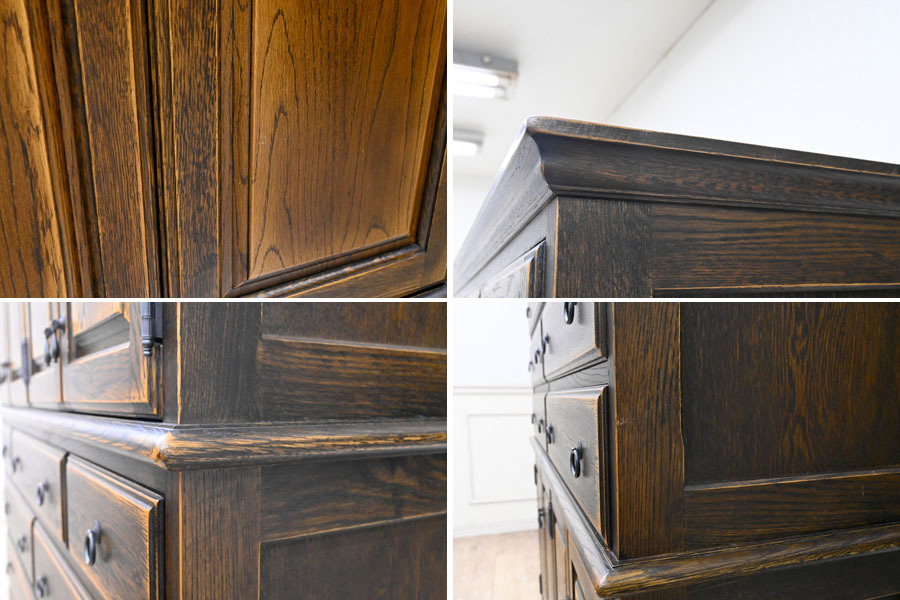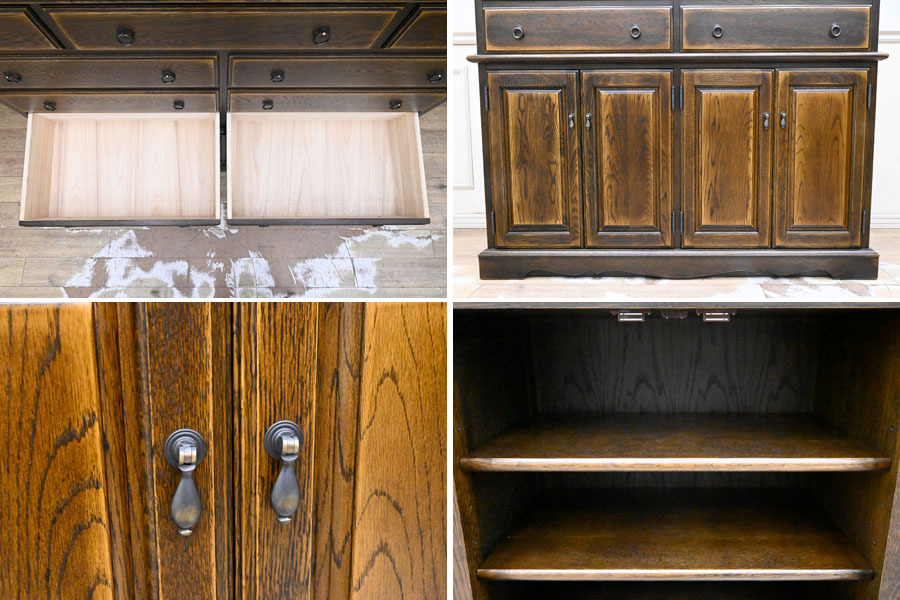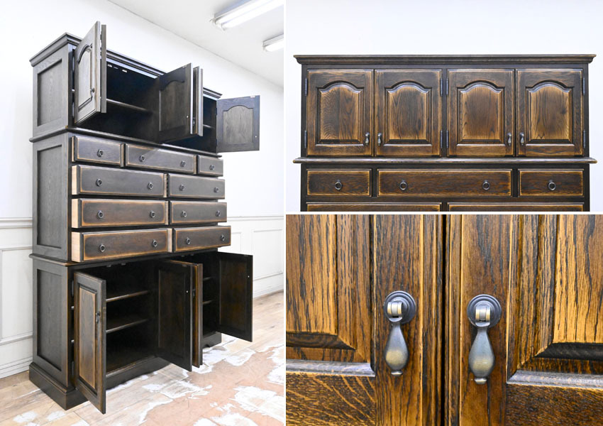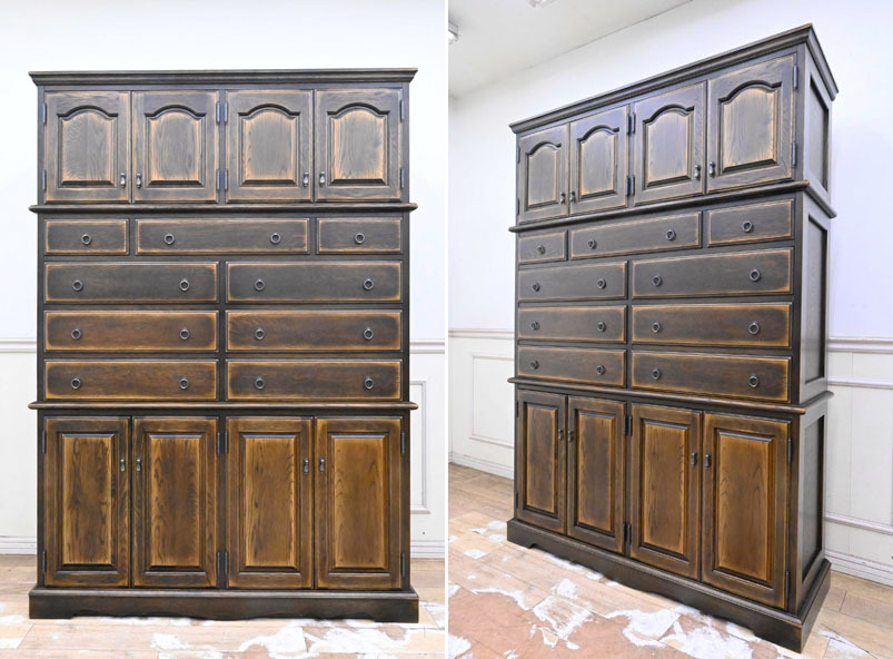 ----------------------------------------------------------------------------------------- ●送料や注意事項は必ずご確認下さい。落札後にトラブルになるケースが増えております。● ◆コンディションは写真・文章にて記載して有りますが、全てのキズの写真は掲載致しておりません。大きなダメージを除き見落とし、記載漏れが有る事はご了承下さい。 ◆当サイトにて出品する商品は多種多彩で、当方商品知識の無い物も多数ありますので落札後の質問やメンテナンス等にはお答えできません。 ◆入札された時点で、画像、文章をご理解していただいたものと判断させていただきます。不明な点は前もってQ&Aからお願い致します。入札後の質問やお電話等でのキャンセルは一切受け付け致しません。 ◆商品説明に「ノークレーム」と記載しているものに関しては、如何なる状況で届いても保証致しません。詳しくは注意事項の「商品到着後について」の最後に記載しておりますのでご確認下さい。 ---------------------------------------------------------------------------------------- 北海道、蝦夷民芸の高級サイドボード、中古品の出品です。 北海道の厳しい原野を育った高級樺材無垢を多用し作られた素晴らしいお品です。 良質な楢材を無垢材多用で作り上げた堅牢なお品です。 アンティーク調に仕上げたお品ですので使い込むごとに味の増すお品です。 幅135 奥43 高190 座高72.5cm 【コンディション】 向かって左下開き戸の隙間隠し有りませんが外観的に特に問題無し。 中古品ですのでキズ、ダコン、汚れ、向かって右側面縁にスレ、キズ、下段の中棚色抜け跡、引出内汚れ、上部天板にも置き跡(通常見えない)等有りますが、中古品としては状態良好です。 新品で購入すると50万円以上するお品ですのでお見逃しの無いように。 | ||