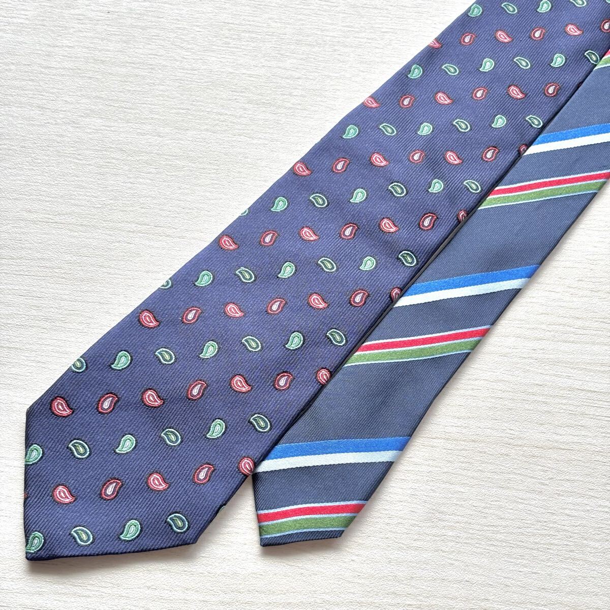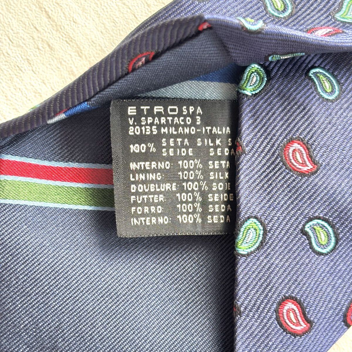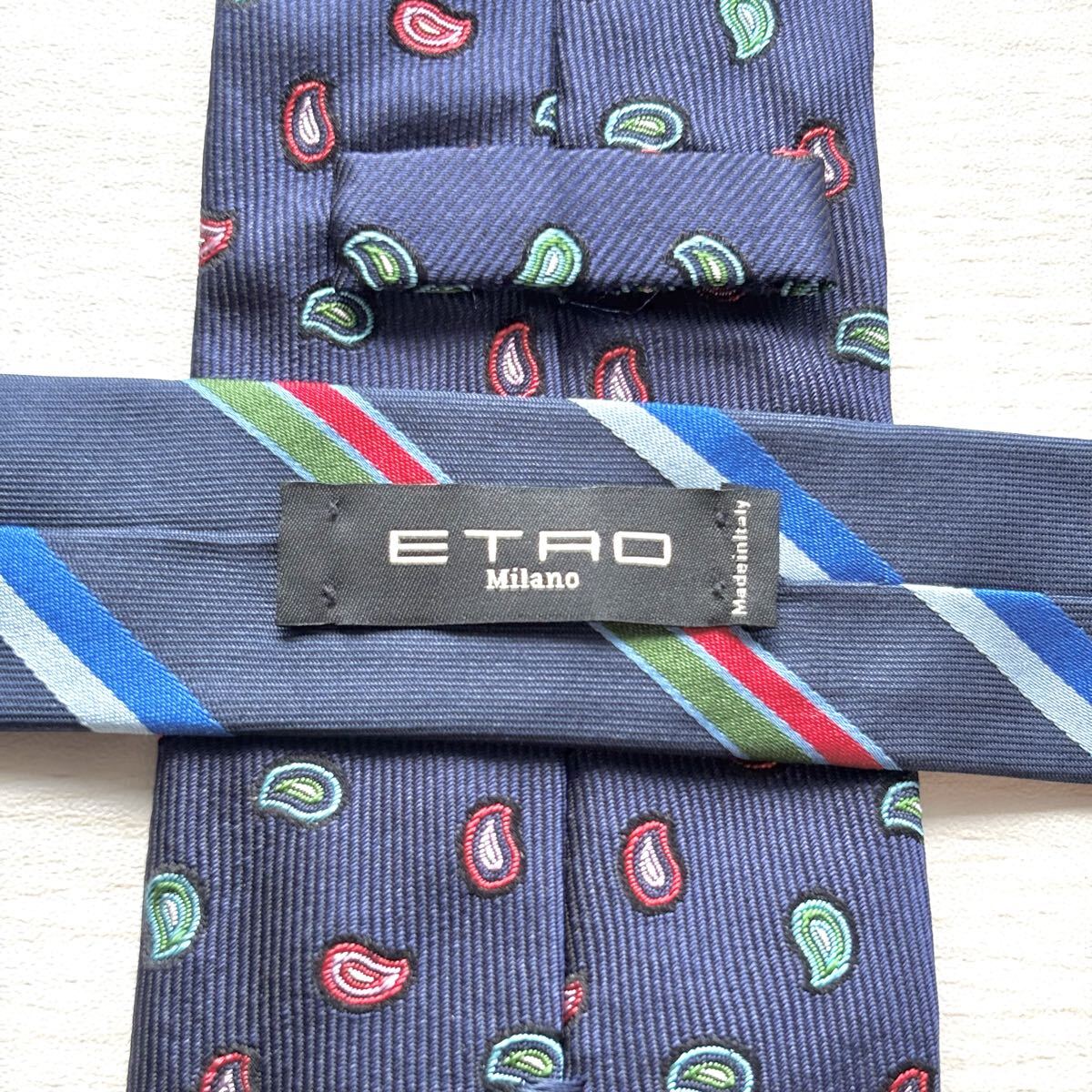 大剣はペイズリー柄、小剣はストライプ柄のETRO エトロのシルクネクタイ。ジャガード織りの美品の状態。