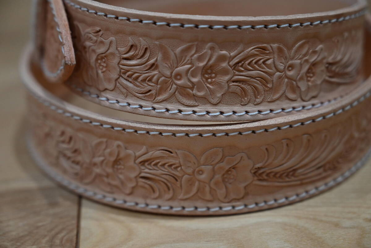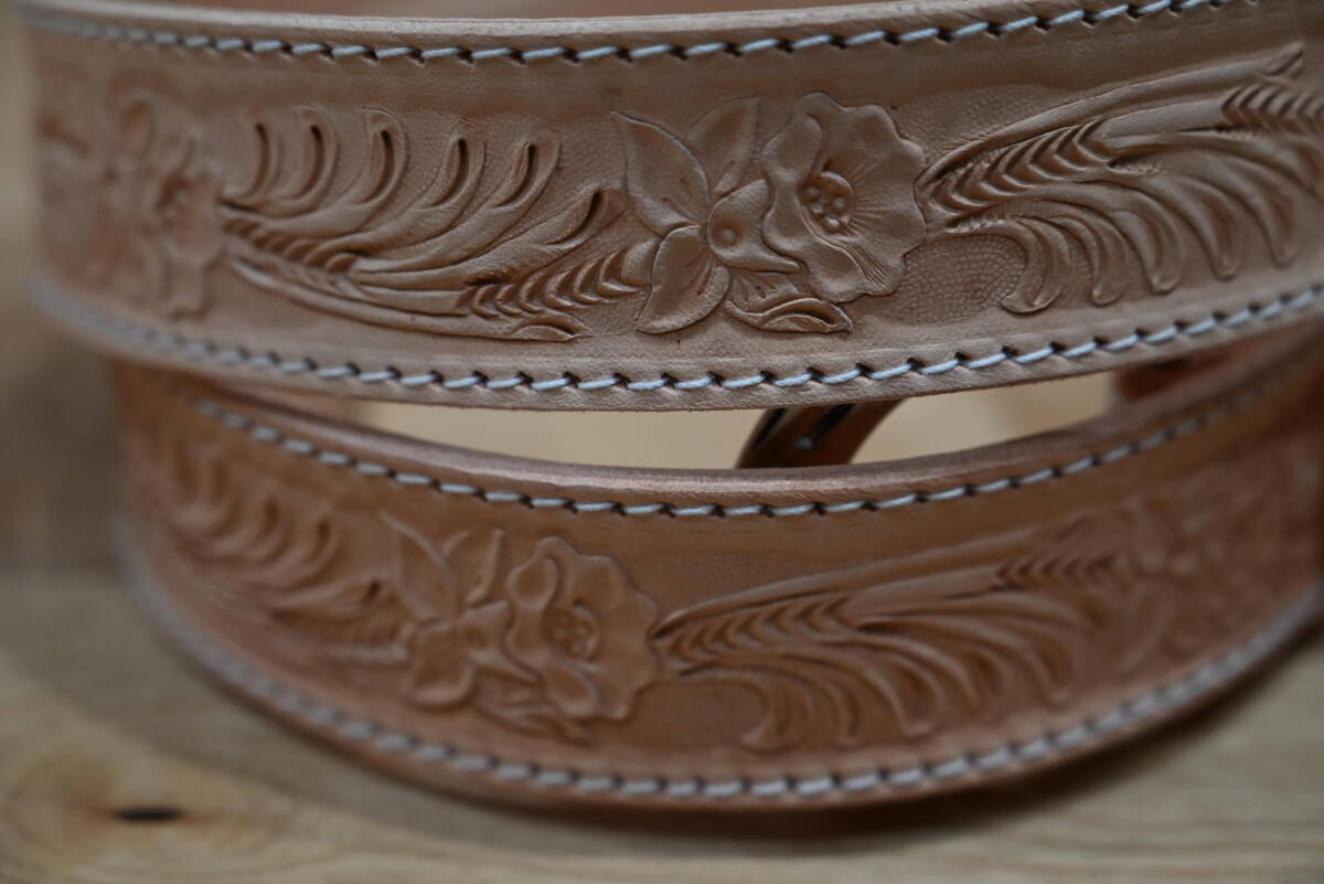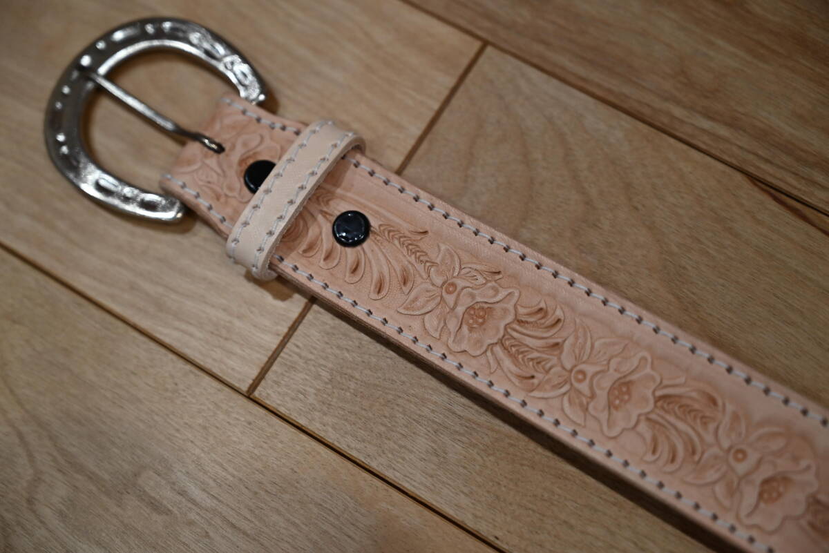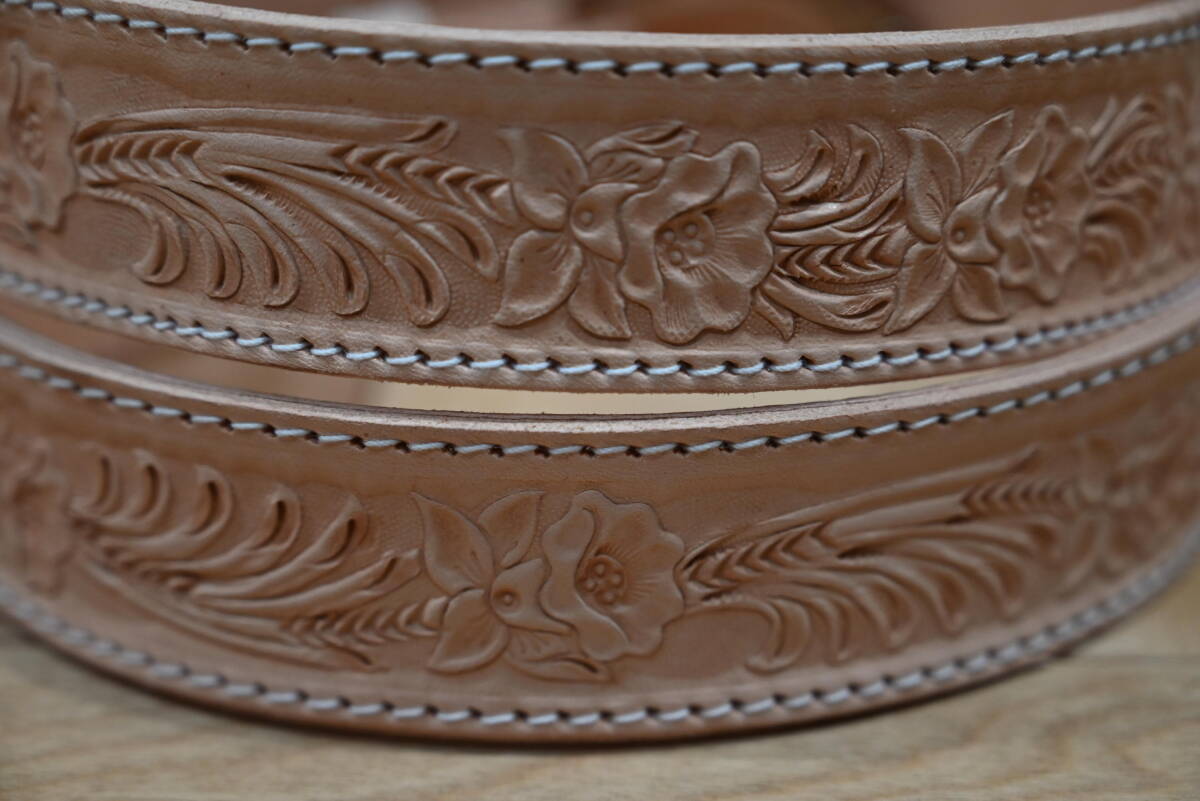 | 商品説明 | 牛革で作成した、カービング ウエスタンスタイルベルトです。 ナチュラルなヌメ革ベースなので、経年変化で色が飴色に変わっていく素材を使っています。両端はステッチ仕上げにしています。 サイズは、ベルト本体は113㎝、ベルト幅は3.8㎝、バックルは6㎝程になります。バックルは馬蹄型のデザインです。 全体に花柄と葉を交互にデザインして、カントリー調の品物になります。裏側はヌメ革を貼っていますので、しっかりした仕上げになっています。厚さは3㎜になります。 ベルトの穴開けは、調節出来るように、購入者の方にお願いします。4㎜コンチョがお勧めです。 バックルの部分はボタンタイプなので、簡単に交換できるようになってます。 発送は、定形外郵便を利用します。送料は、450円になります。 こちらは、ハンドメイドで、ヌメ革素材を使っていますので、多少の傷や汚れ等はご了承下さい。細かい点まで、気になる方はご遠慮下さい。 |