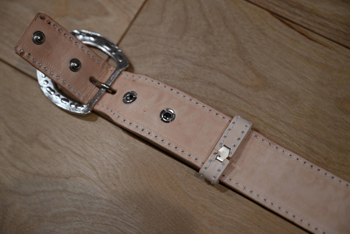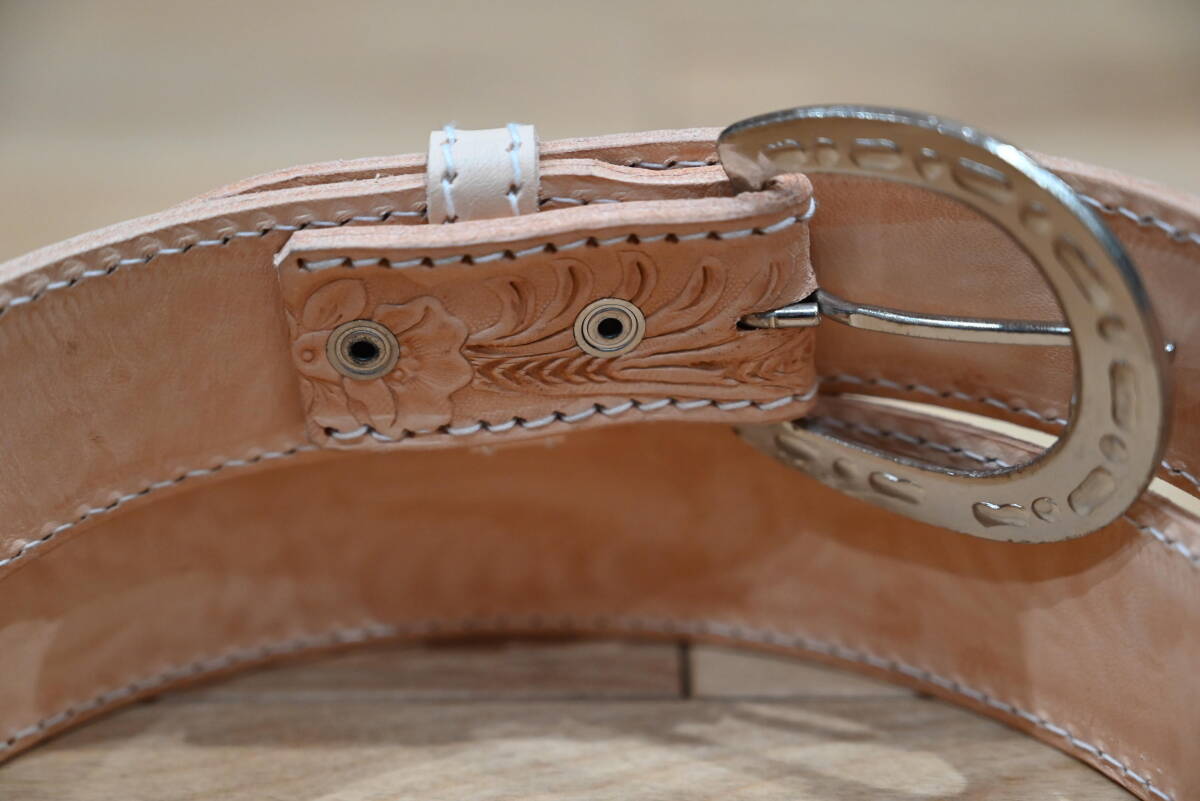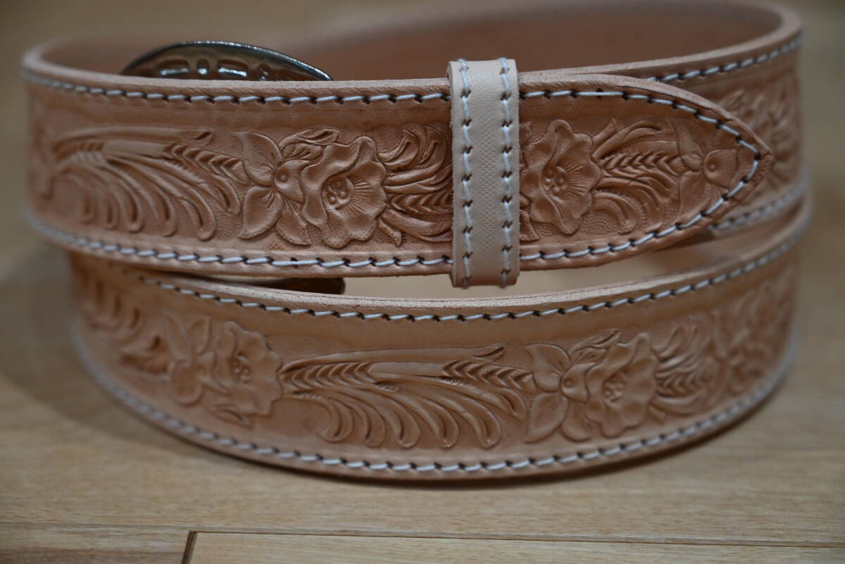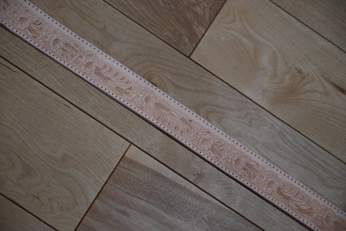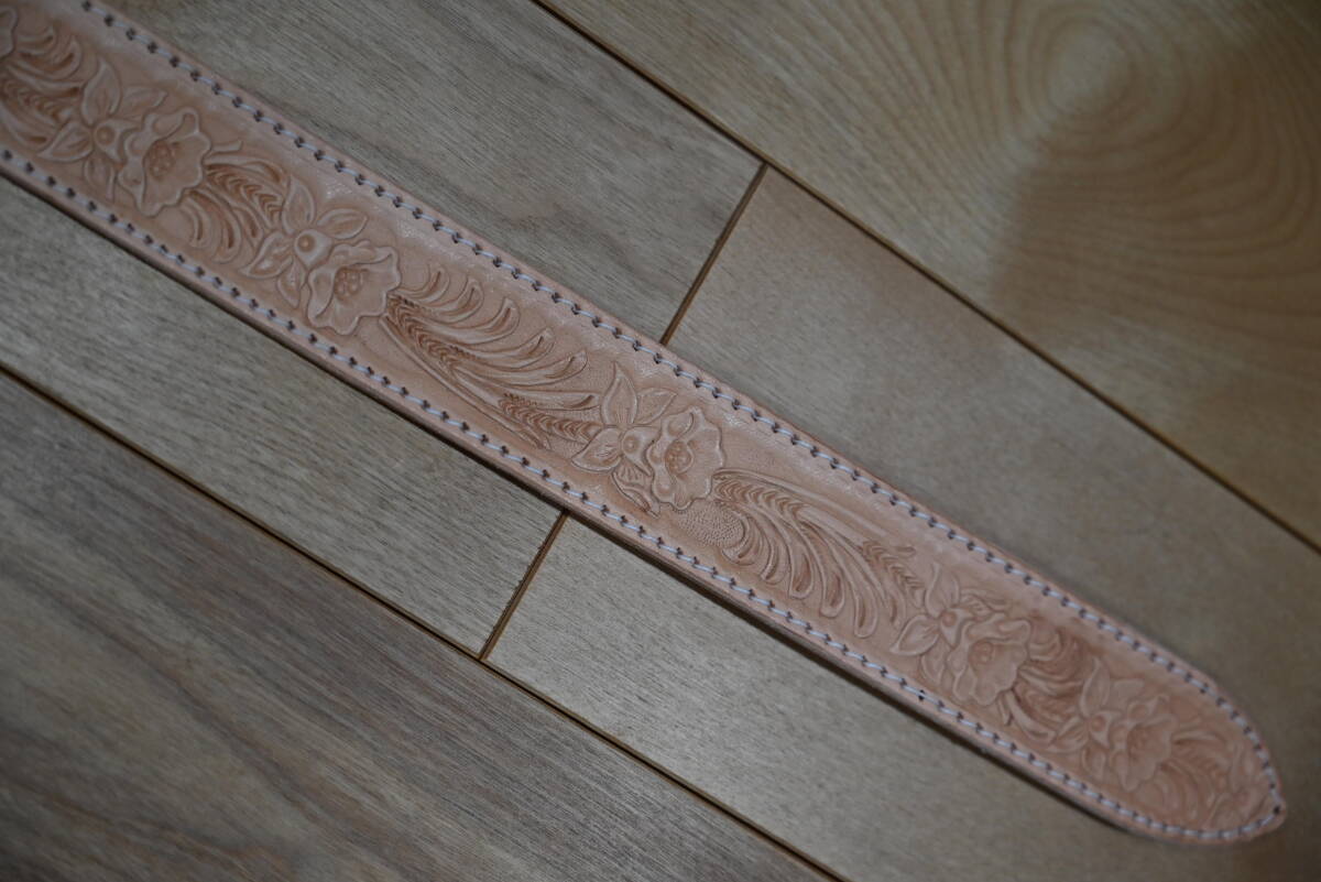 | 商品説明 | 牛革で作成した、カービング ウエスタンスタイルベルトです。 ナチュラルなヌメ革ベースなので、経年変化で色が飴色に変わっていく素材を使っています。両端はステッチ仕上げにしています。 サイズは、ベルト本体は113㎝、ベルト幅は3.8㎝、バックルは6㎝程になります。バックルは馬蹄型のデザインです。 全体に花柄と葉を交互にデザインして、カントリー調の品物になります。裏側はヌメ革を貼っていますので、しっかりした仕上げになっています。厚さは3㎜になります。 ベルトの穴開けは、調節出来るように、購入者の方にお願いします。4㎜コンチョがお勧めです。 バックルの部分はボタンタイプなので、簡単に交換できるようになってます。 発送は、定形外郵便を利用します。送料は、450円になります。 こちらは、ハンドメイドで、ヌメ革素材を使っていますので、多少の傷や汚れ等はご了承下さい。細かい点まで、気になる方はご遠慮下さい。 |