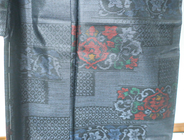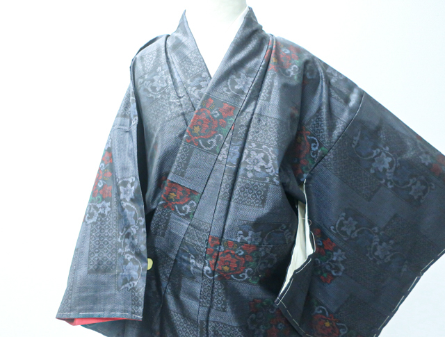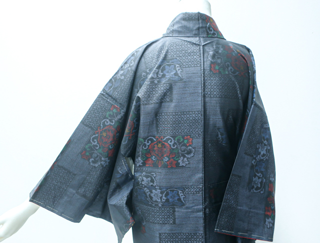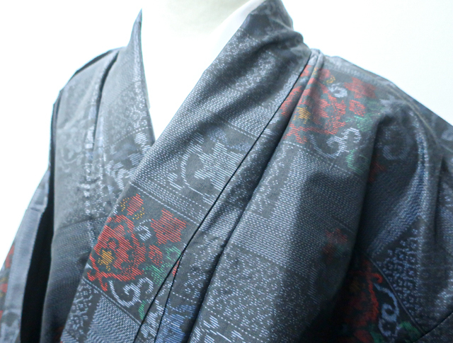 リサイクル商品のため、胴裏・衿裏にスナップボタンによる汚れ、黄ばみがございますが着用可能なお品です。 地色は、藍色です。 1枚目の画像が近いお色かと思われます。 素材は正絹です。 |