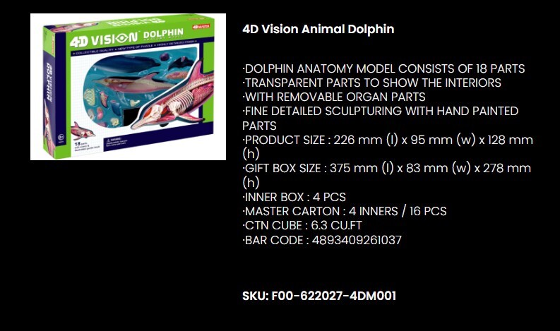 4Dビジョン イルカ 解剖モデル Dolphin 海豚 3D 立体 パズル 新品未開封 4Dビジョン イルカ解剖モデル4D VISION Dolphin 4dmaster famemaster stem 立体パズル知育玩具知育玩具 フェイムマスター Fame Master 4D master 知育玩具STEM 4D VISION 622027 Dolphin Anatomy Model 4Dビジョン イルカ解剖モデル 18個のパーツからなるイルカの全身骨格解剖モデル 骨格と臓器が見える透明なボディ 取り外し可能な骨と臓器パーツ付き 手描きパーツを使用した精巧な彫刻 梱包サイズ: 375 mm (長さ) x 275 mm (幅) x 80 mm (高さ) 詳細はfamemaster.com公式サイトをご覧ください。 【商品の状態】 使用状況: 新品 未開封 注意事項: 外箱に輸送上に生じるスレやへこみなどがある場合がございます。予めご了承ください。 不明点はご質問ください。 まとめ買い大歓迎。2点以上ご購入で10%オフ。