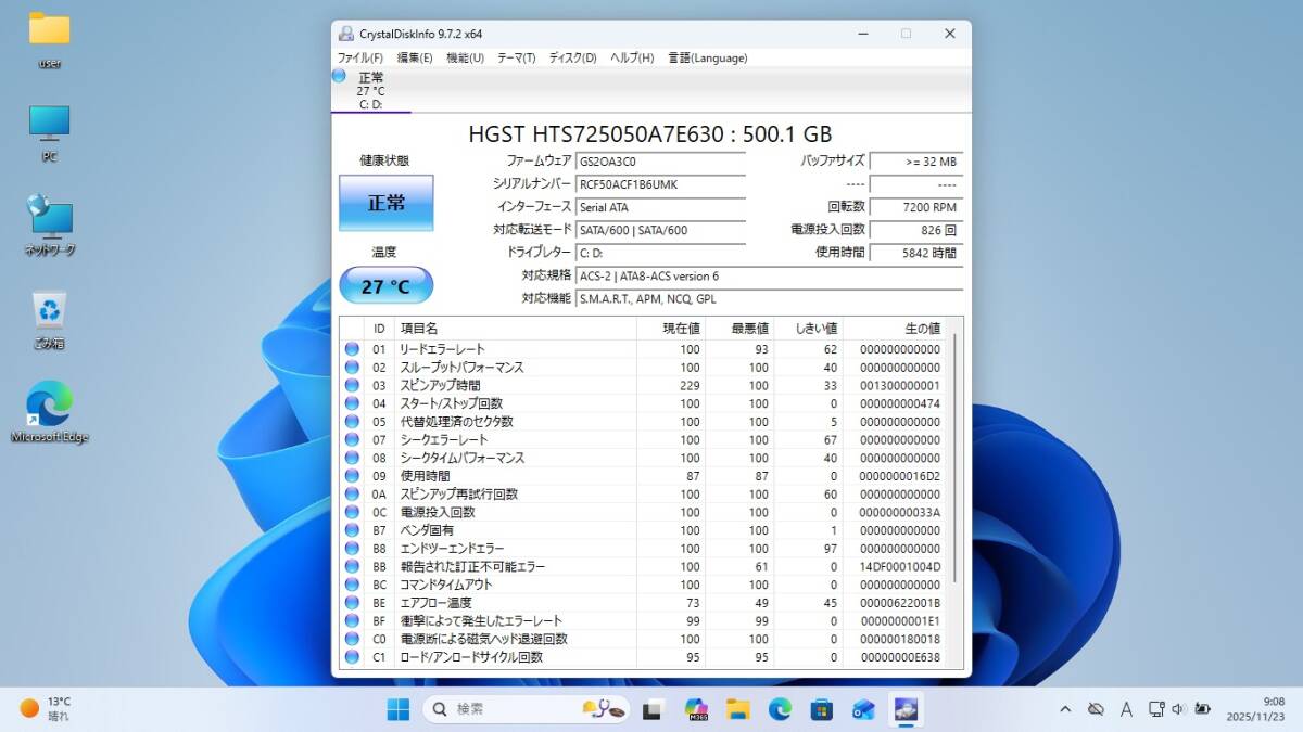 OS                   Windows 11 Pro 64bit クリーンインストール