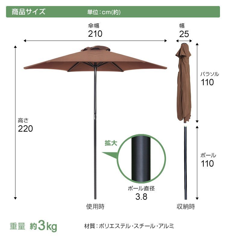 | \ レジャー、お庭でのバーベキュー時の日差しよけにピッタリ! / ひもをを引っ張ることで、パラソルの開閉がラクにできます! UVカットが施された210cmサイズのパラソルが強い日差しから守ってくれるので、 直射日光を気にせず快適にガーデンライフを楽しんでいただけます! 撥水加工も施してあるので、急な雨にも安心です。 アルミ製支柱なので木製パラソルと比較して軽量! ご自宅のお庭、バルコニー、テラスや店舗先のカフェペースなどにお使いいただけます。 河原でのバーベキュー、夏場にお子様のプール遊びの時にご使用になっているお客様もいらっしゃいますよ♪ ■商品コード: パラソル:ACB001BR ベース:ODTT14A ■商品仕様 (パラソル) カラー:ブラウン 素材:ポリエステル、スチール、アルミ 重量(約):3kg サイズ(約) ・使用時:傘幅210cm×高さ220cm ・収納時(パラソル):110cm×25cm ・収納時(ポール):長さ110cm ・ポール直径:3.8cm (ベース) カラー:ブラック サイズ(約):幅450×奥行450×高さ270cm 重量(約):1.5kg 水を入れた時の重量(約):21.5kg 対応パラソル(約):直径40mm対応 材質:ポリエチレン他 ■注意事項 ・傘生地には撥水加工をしておりますが、完全防水ではありません。 ・風や雨が強い日の使用は危険ですので、ご使用しないでください。 パラソルやベースを地面に固定しても突風や瞬間的な豪雨などでパラソルが破損する場合がございます。 そのような自然現象による破損につきましては保証の対象外となりますのでご注意ください。 ・パラソルはテーブルにさすなどパラソル支柱の中間を固定していただきご使用をしていただくことを推奨いたします。 ・商品は、モニターによって色合いが異なって見える場合があります。 ・仕様・デザインは改良のため予告なく変更することがあります。 ■保障期間 7日間 ※商品到着後7日以内の初期不良・破損のみご対応させていただきます。 【新品未使用品です】 |