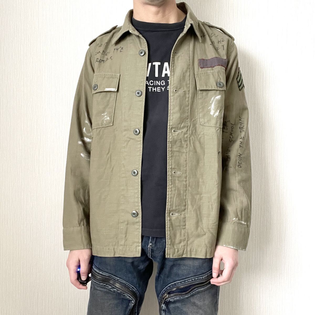 手書き風のプリントやペイントがユニークなデザインのミリタリーシャツです。