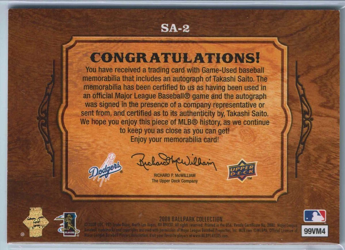 斎藤隆 ジャージ サイン 2008 Upper Deck Ballpark Collection - Single Swatch Jersey & Auto - Dodgers ドジャース 横浜ベイスターズ