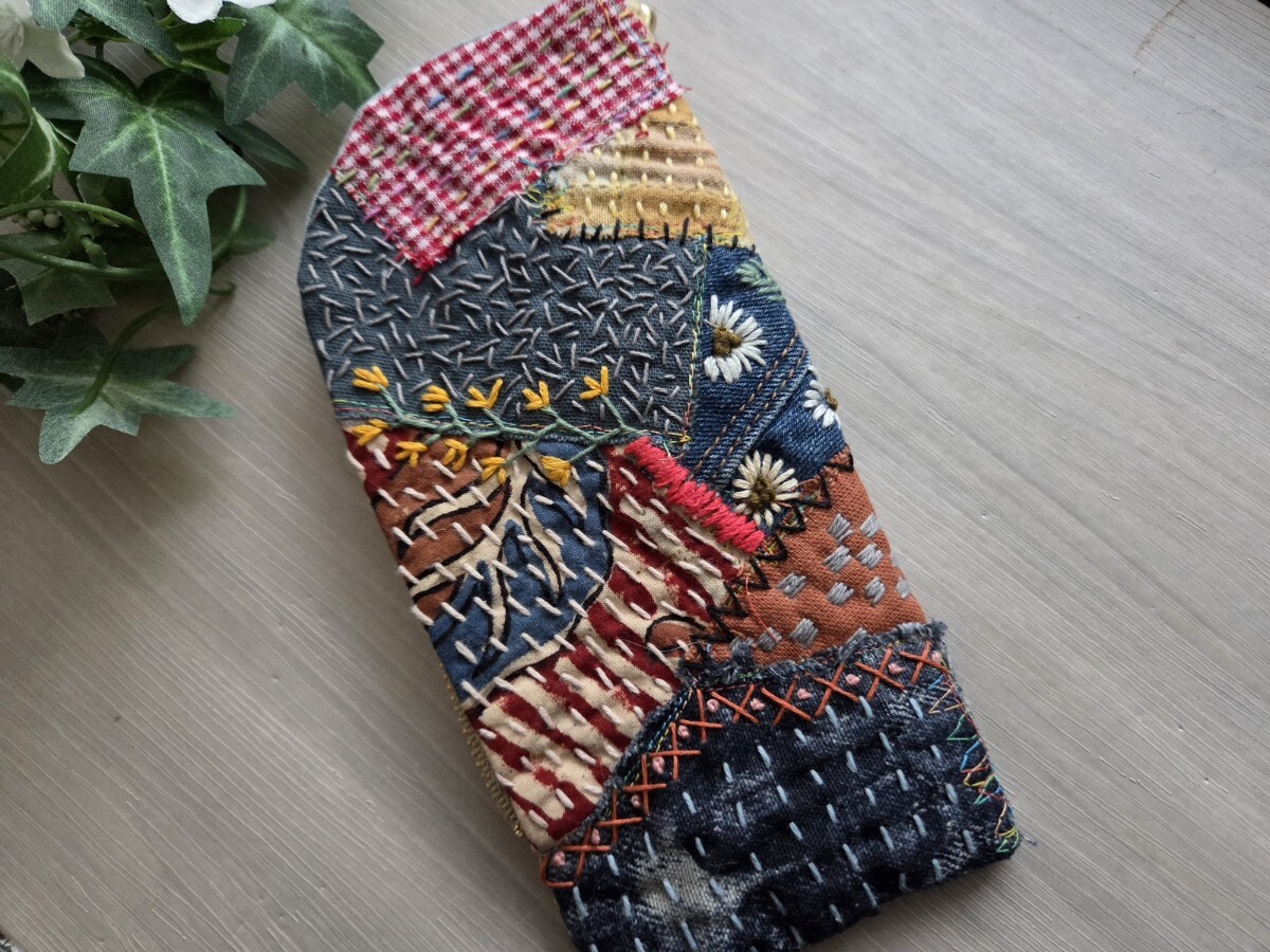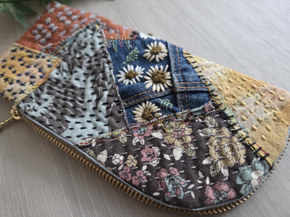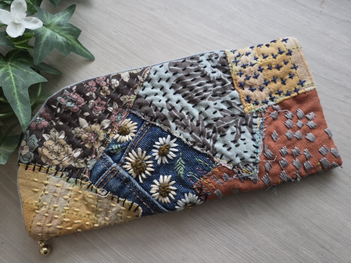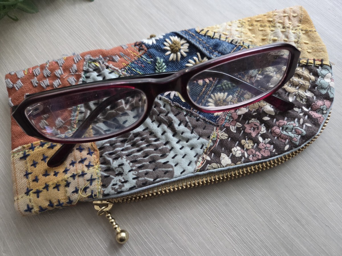 メガネケースにもペンケースにもなるファスナーポーチを作りました。土台布にサラシを使っています。ミシンでサクサクと繋げてた後に、手縫いで刺し子や刺繍を施しました。ファスナー20cm使用しています。