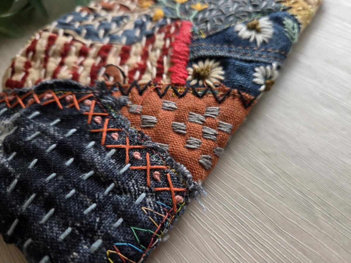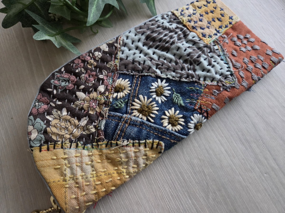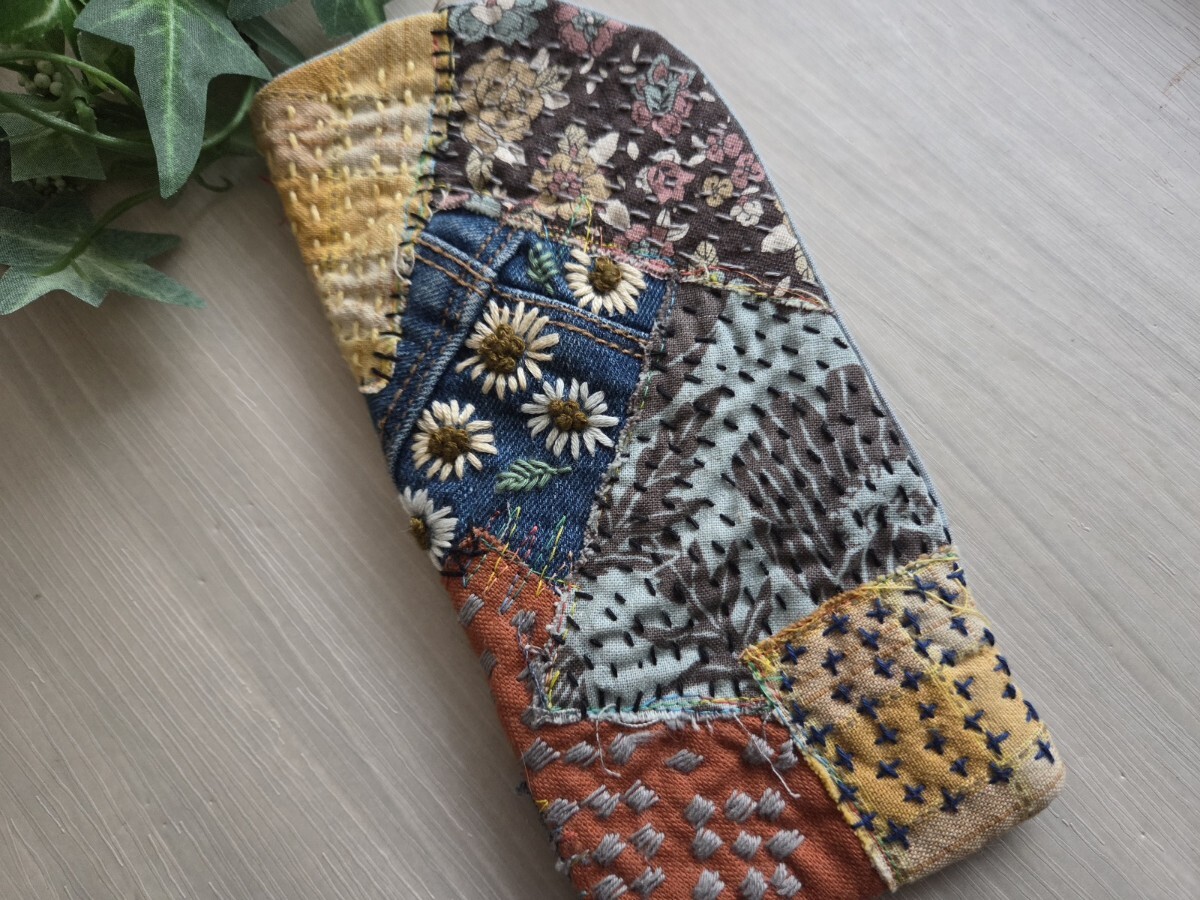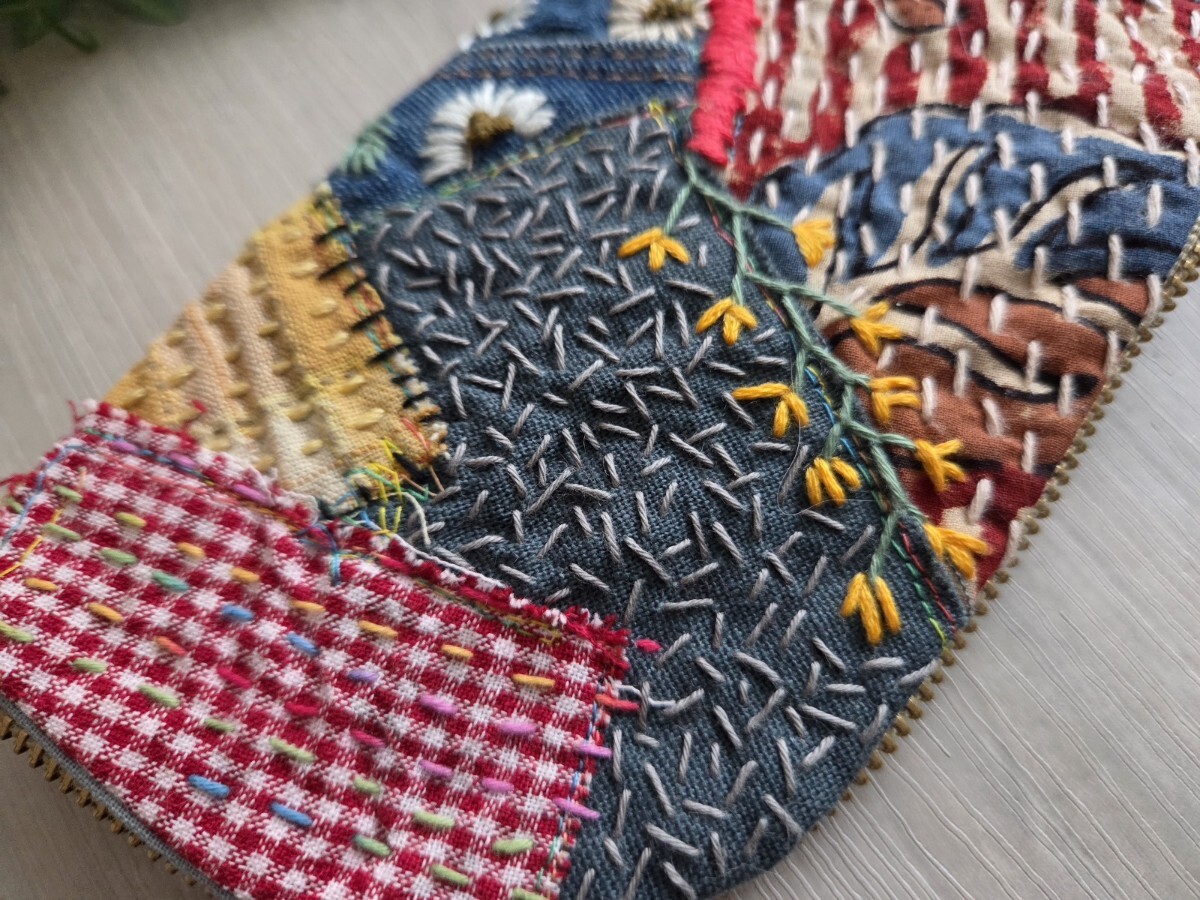 メガネケースにもペンケースにもなるファスナーポーチを作りました。土台布にサラシを使っています。ミシンでサクサクと繋げてた後に、手縫いで刺し子や刺繍を施しました。ファスナー20cm使用しています。