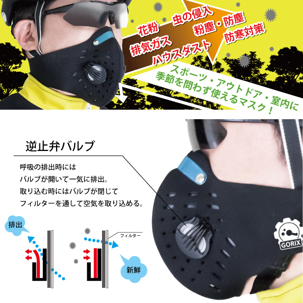 外出時、自転車移動、室内、登山やアウトドア、スポーツの際に季節を問わず一年中使用できる便利な各種機能付きマスク。 折りたたんでウェアのバックポケットにしまええるので空気が悪い場面のみ着用するという 仕様方法もありです。 ◎濃密フィルターを通して空気を取り入れ、呼吸の排出には逆止弁バルブを利用して中に留めず排出します。 ◎ハウスダスト、粉塵 等のアレルギー対策としても安心なダストシールドマスク。 ◎室外時での 排気ガス、防塵・防虫、防寒として、汚染された外気から身を守ります。 ◎アウター本体とインナーフィルターの二重構造、アウターを後頭部で固定するので顔への密着性が高い。 ◎折り曲げ自在のノーズクリップ付属で鼻周りの形状にフィット。眼鏡なやサングラスの曇りを抑えます。 ◎伸縮性のあるライクラ素材で、顔にフィットするのでスポーツをしてもズレにくいマスクです。 サイズ:長さ31.5x高さ14.5cm 重量:50g 材質:ライクラLycra + スチレンブタジエンゴム(SBR) ※フィルターのみの単品販売はございません。 |