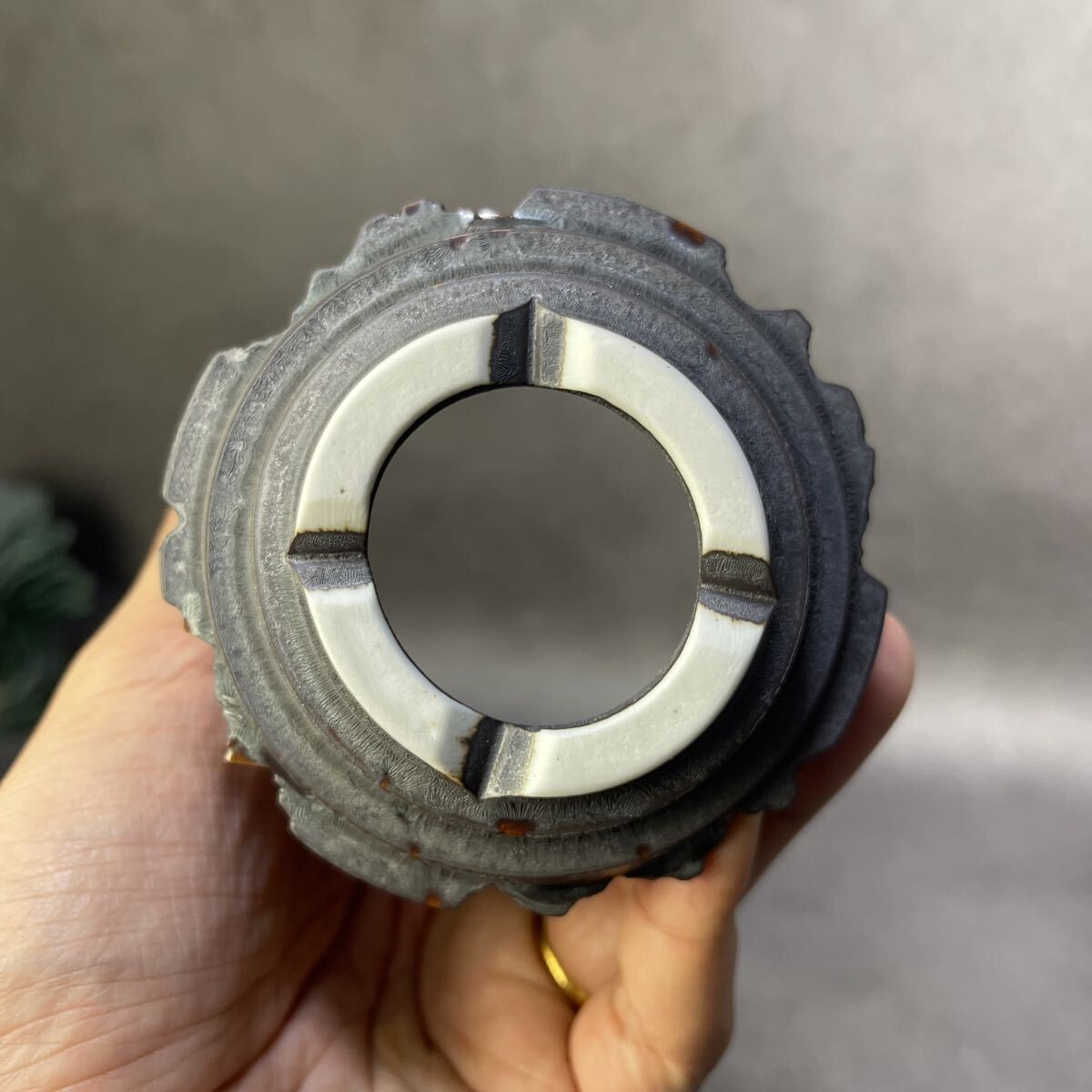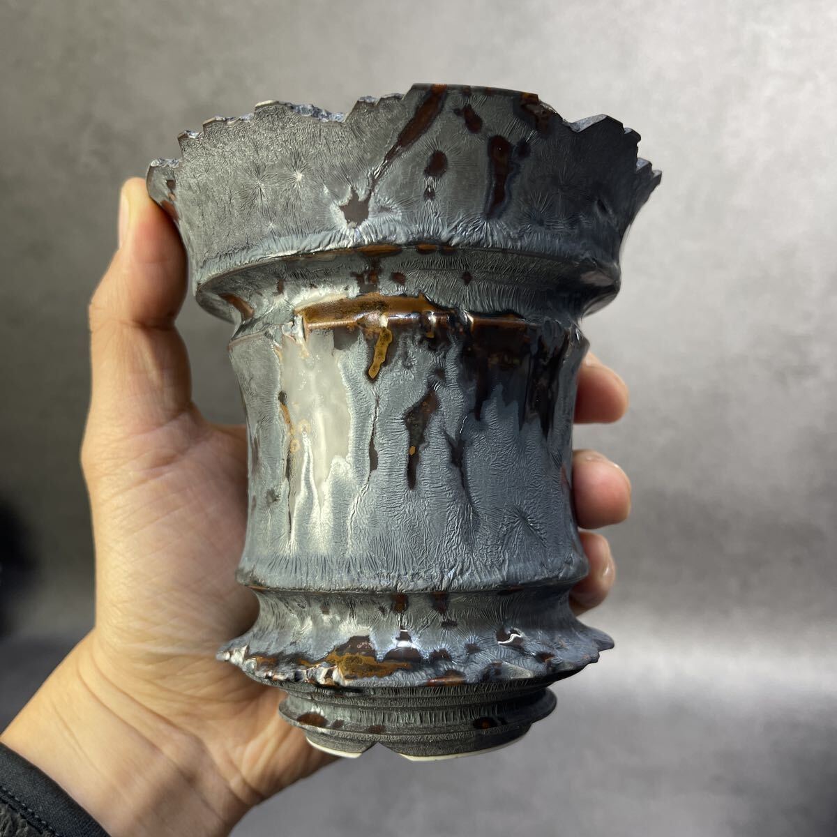 深い鉄灰色を基調に、羽根状の結晶模様と赤茶の鉄斑が重なり合う、火山窯変らしい激しい景色を持つ一点です。高温焼成により、表面には焦げた鉄のような質感や霜のような白い曇りが自然に現れ、再現の難しい唯一無二の表情に仕上がっています。