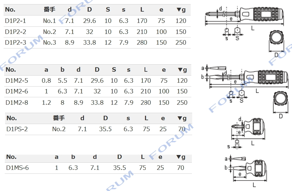 ●クロスD1P2-1・-2・-3、マイナスD1M2-5・-6・-8、スタッビD1PS-2・D1MS-6