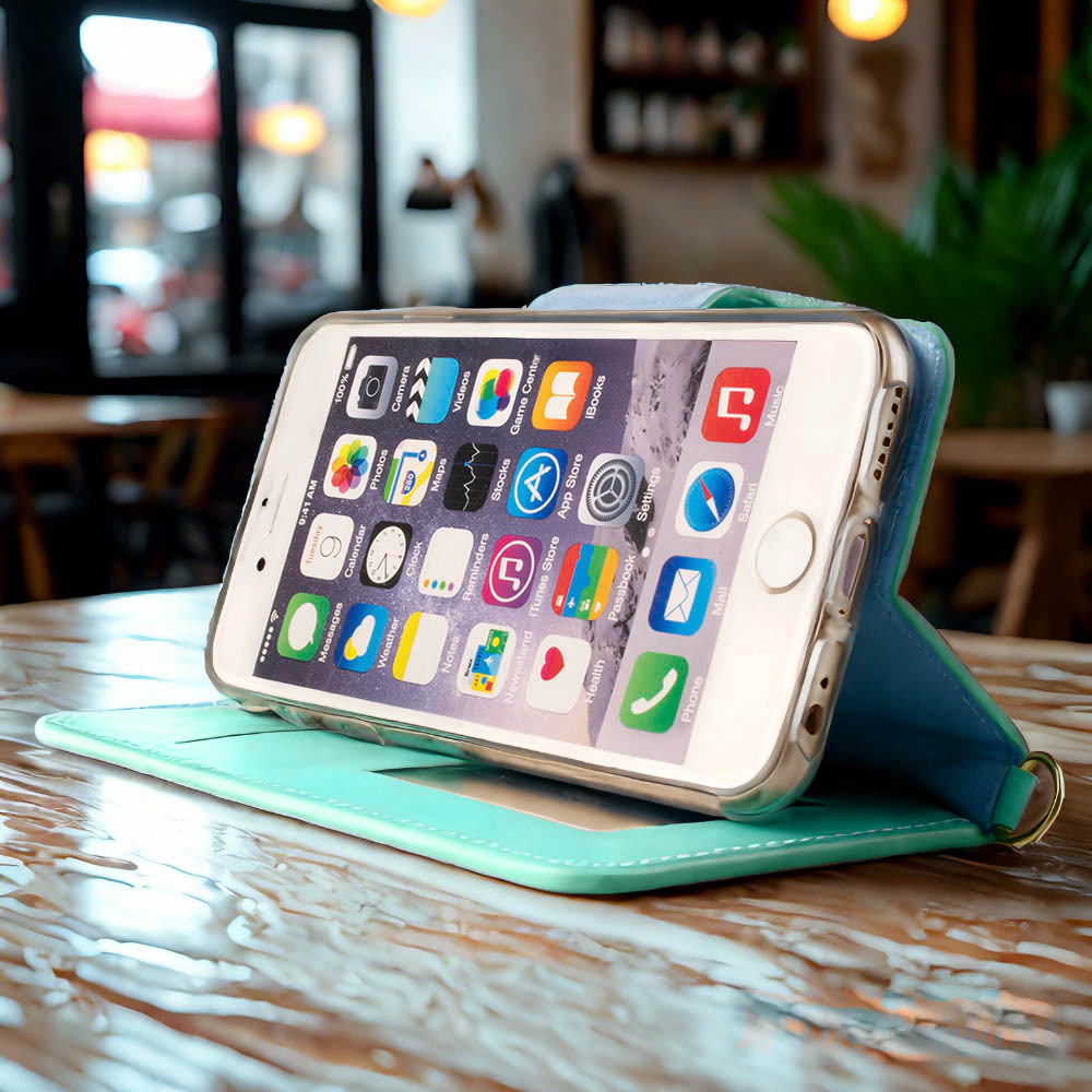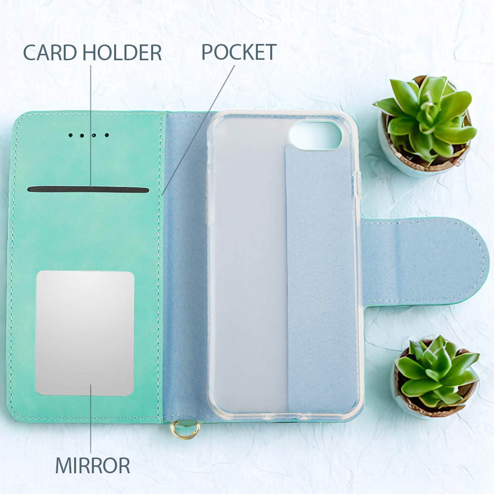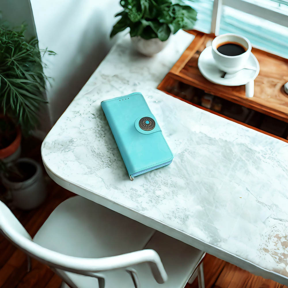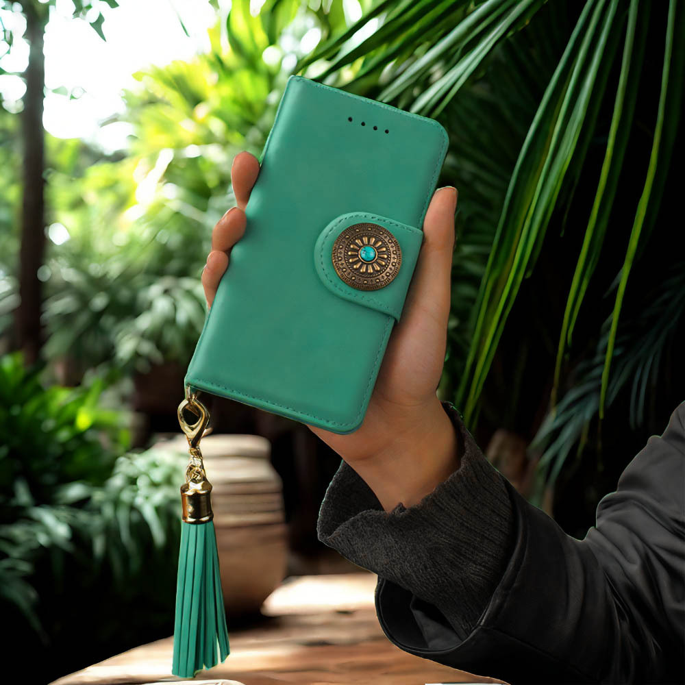 ベルト部分はゴージャスなコンチョボタン付き、手帳型スマホケース