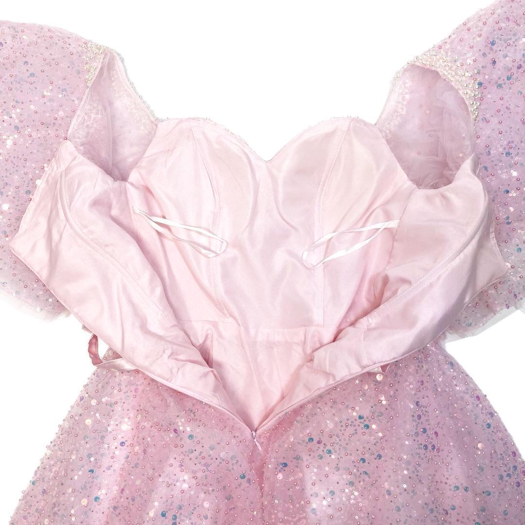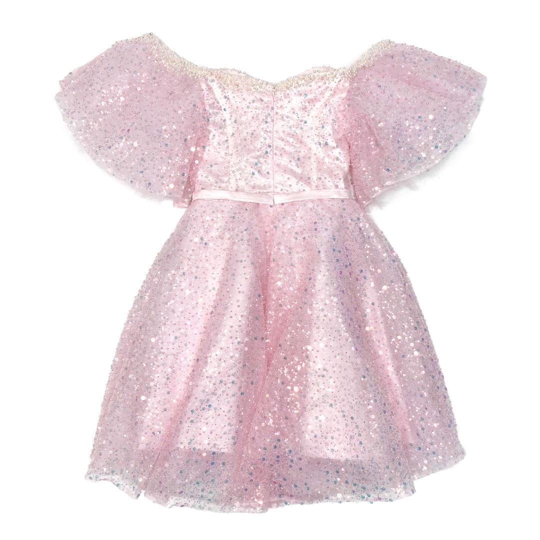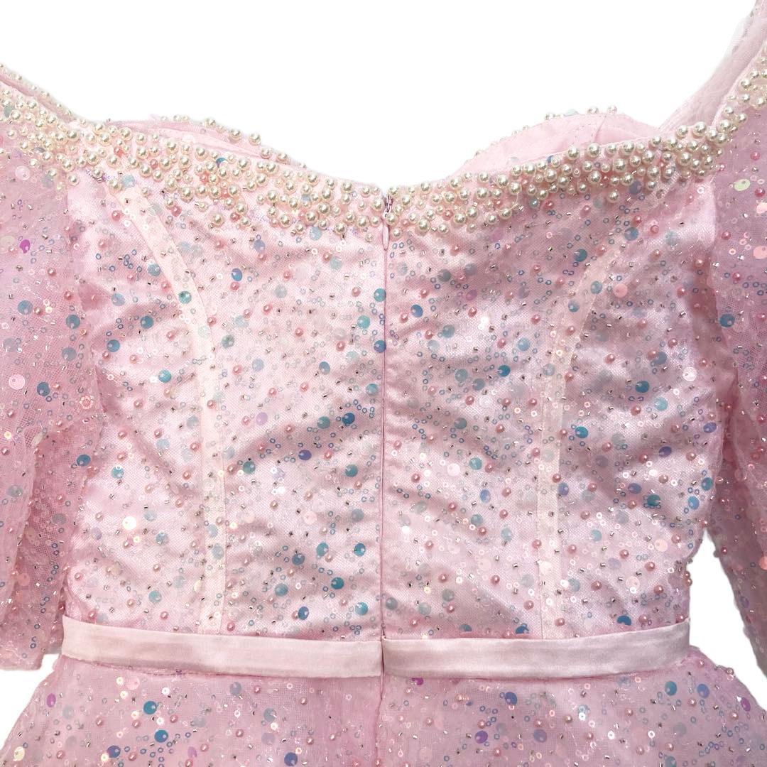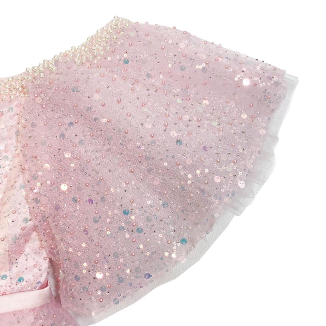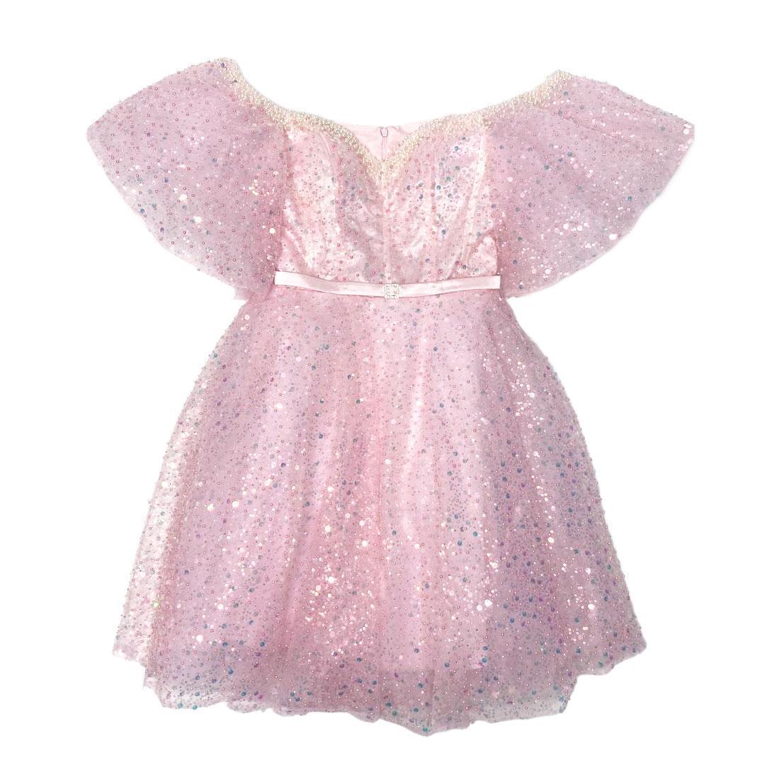 全体に散りばめられたスパンコールが光を反射してきらめく、華やかなピンクのミニドレスです。