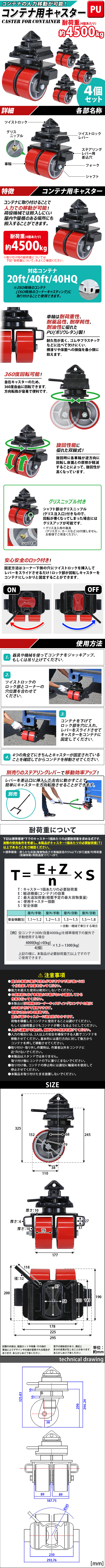 | 商品紹介 | ■コンテナの人力移動が可能!コンテナ用PU製自在双輪キャスターです! ■20ft、40ft、40HQのコンテナに対応! ■荷役機械では搬入しにくい屋内や屋根のある場所にも搬入することができます。 ■車輪は耐荷重性、耐摩耗性、耐油性に優れたPU製! ■自在キャスターのため、360度自由に回転できます。方向転換が容易で便利です。 ■ツイストロックでコンテナにしっかりと固定できるので安心安全です。 ■シャフト部はグリスニップル(グリス注入口)付きです。 ■耐荷重(1個あたり):約1500kg ■耐荷重(4個あたり目安):約4500kg ※実際の使用条件によって変動いたします。詳細は上記「耐荷重について」をご確認ください。 ※一般的な海上ドライコンテナの自重は下記になります。 ・20ft:約2200~2400kg ・40ft:約3700~4000kg ・40HQ:約3900~4500kg ■牽引速度:約4km/h以下 ■最大傾斜角:約15度以下 ※危険ですので、人力の場合は傾斜地での使用を避けてください。 ■使用温度範囲:約-10℃~60℃(50℃以下で連続使用可能) ■重量:約22.9kg(1個あたり) ■材質:粉体塗装鋳鋼(金具)、粉体塗装スチール(フォーク)、亜鉛メッキスチール(シャフト)、PU[ポリウレタン](車輪)、鋳鉄(車輪芯金) ■旋回部:キングピンレススチールレースウェイ ■シャフト部:ダブルボールベアリング内蔵 ■個数:4個 ●新品商品ではありますが、輸入商品の為、多少の擦り傷などがある場合がございますので、ご納得の上ご購入下さいませ。 ●ご購入後、お客様ご都合によるご返品、ご返金等は一切お受け致しておりません。 ●本商品を使用した際に発生したトラブル、事故につきまして、当社は一切の責任を負いません。ご使用に関しましては、全て自己責任にてお願い致します。 |