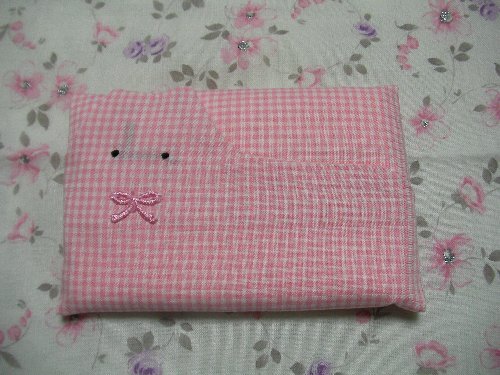 ポケットティッシュカバー☆ピンク色☆細ギンガムチェック☆ピンクリボン☆ティシュ入り☆猫型☆ポケットティッシュケース☆B☆