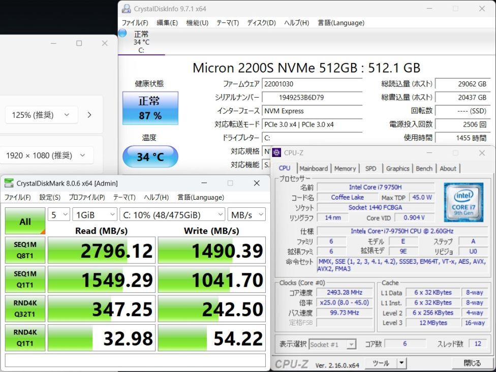 | CPU: 超高速 Intel 超高性能 第9世代Core i7-9750H 2.6Ghz、 6コア12スレッド (ターボ・ブースト利用時の最大周波数 4.5GHz) |