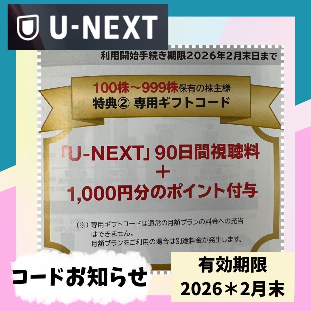 90日間視聴無料+1000ポイントギフトコード コード通知-USEN-NEXT(U-NEXT)株主優待 登録期限 2026年2月末 優待で頂き新品未使用