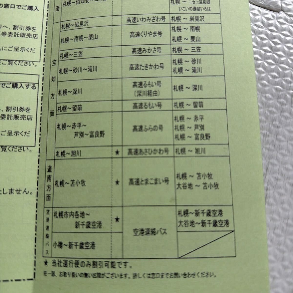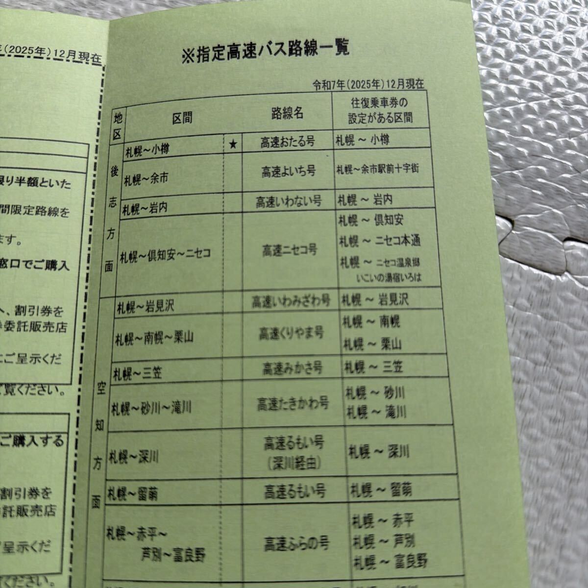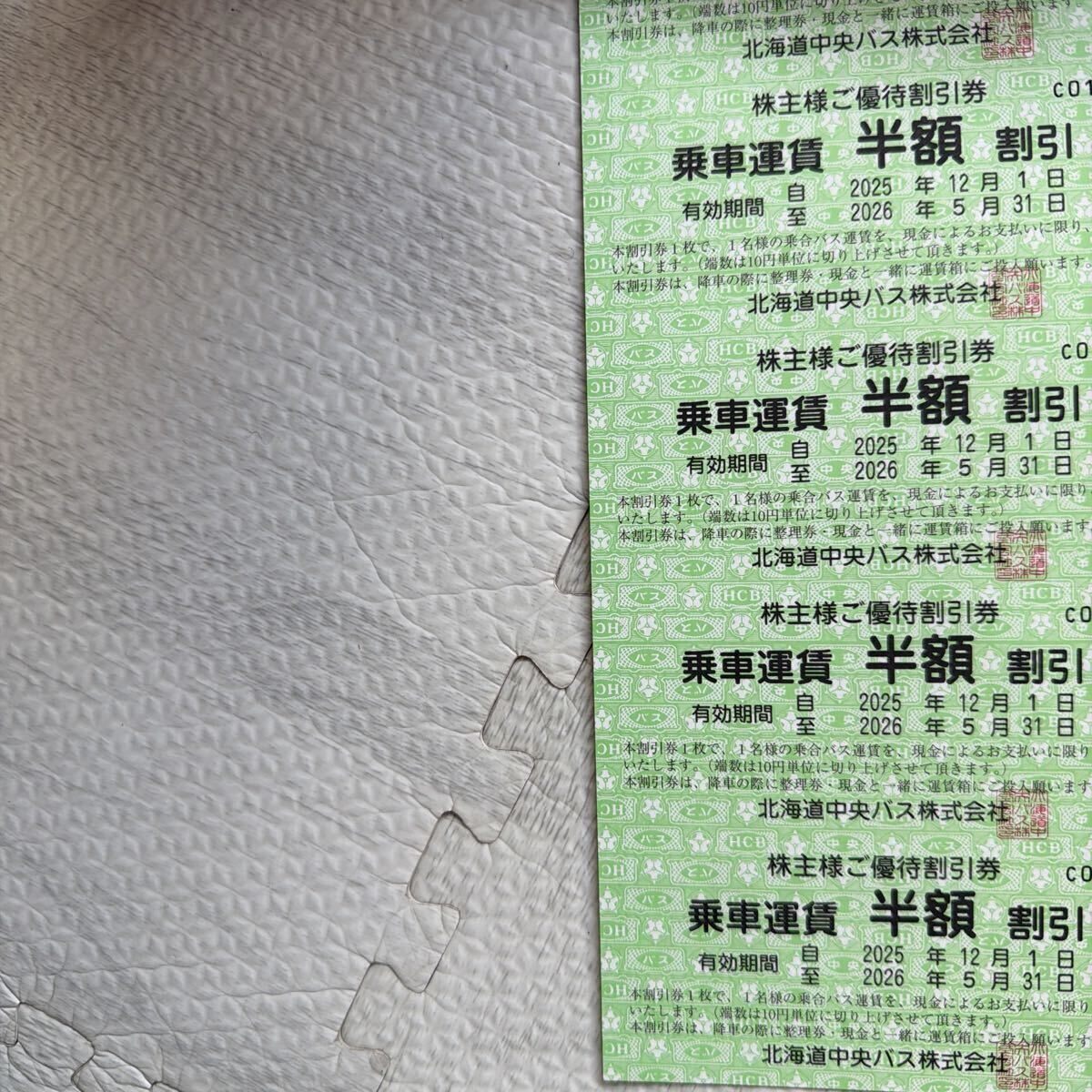 北海道中央バスの株主優待割引券30枚です。1枚で乗合バス1名様分料金1回分が半額となります。(現金払いのみ)15枚で指定高速バス路線(写真参照)がターミナル等の窓口購入に限り半額となります。(片道または往復乗車券)2025.12.1から2026.5.31まで有効です。送料込みでゆうパケットポストミニで発送いたします。