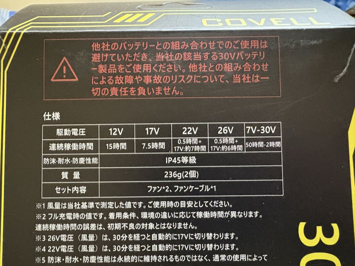 COVELL 空調服用ファン、バッテリーセット(空調服は付属しません)