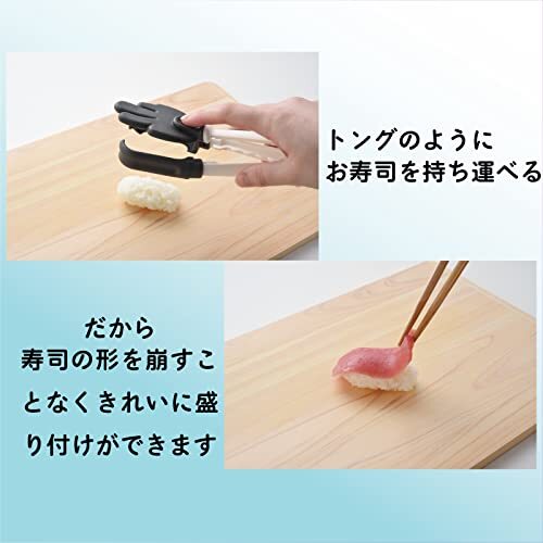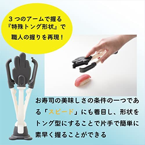 ・【手早くカンタン】お寿司の美味しさの条件の一つである「スピード」にも着目し、形状をトング型にすることで片手で簡単に素早く握ることができます。寿司飯を集めてシャリを成型し、ネタを乗せれば ハイできあがり!