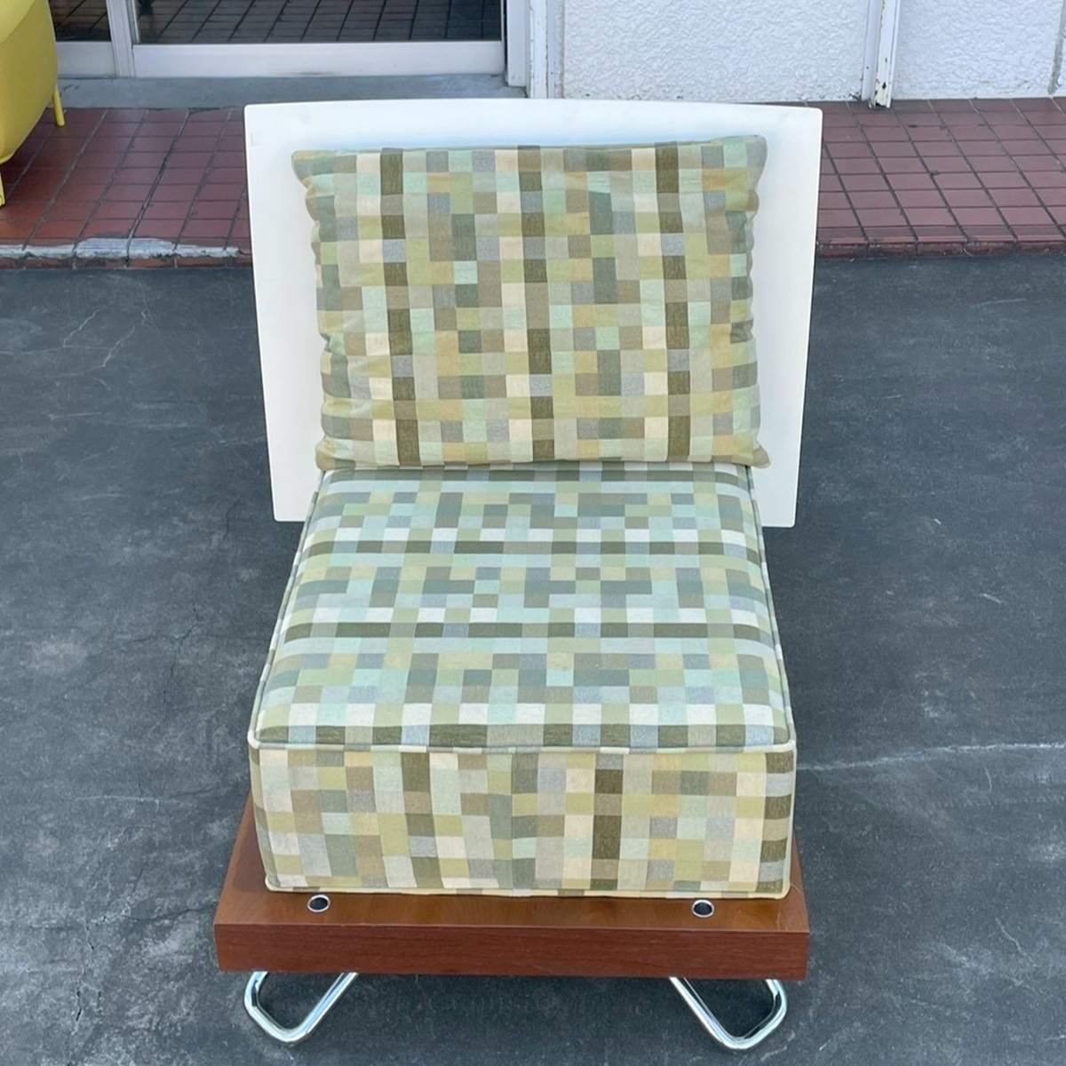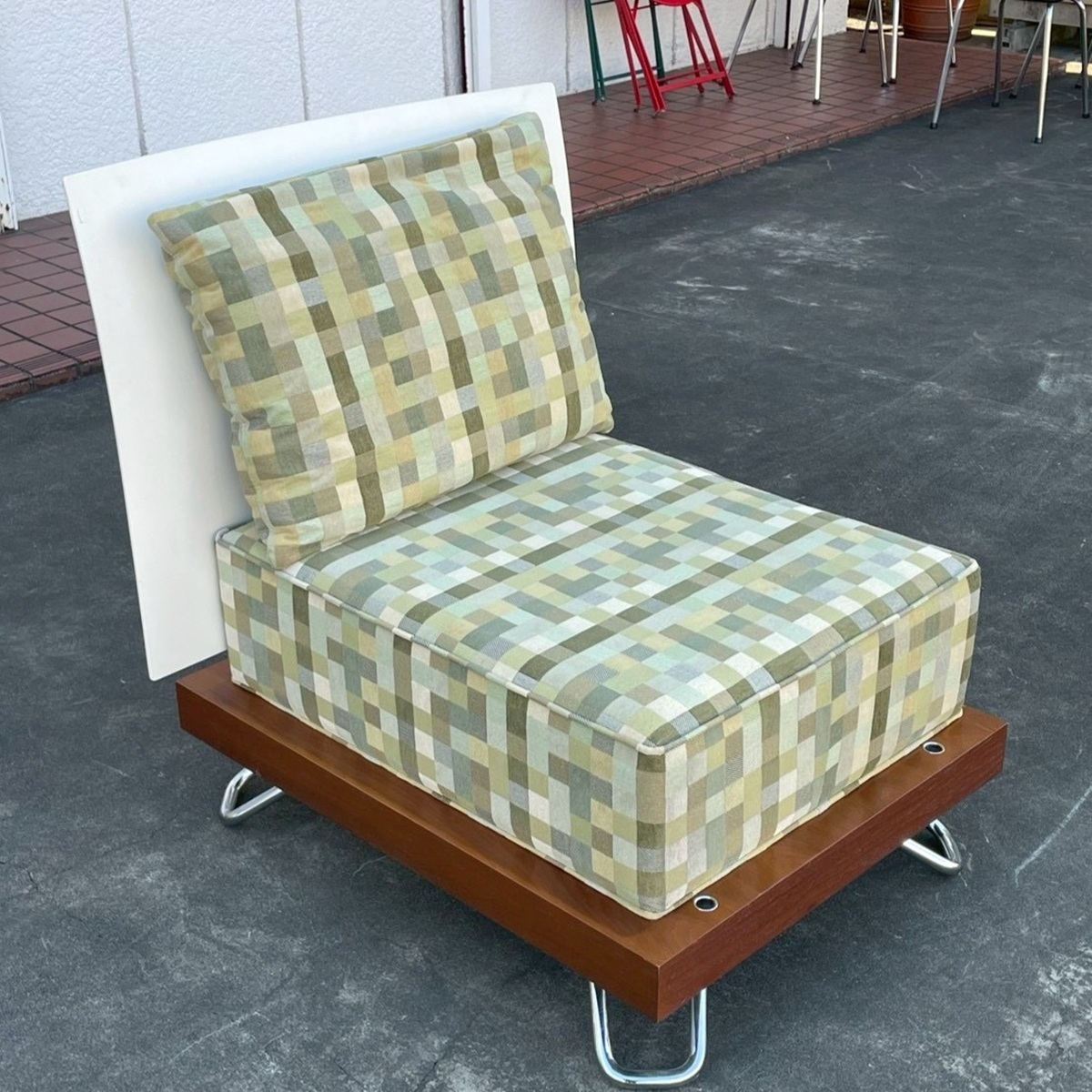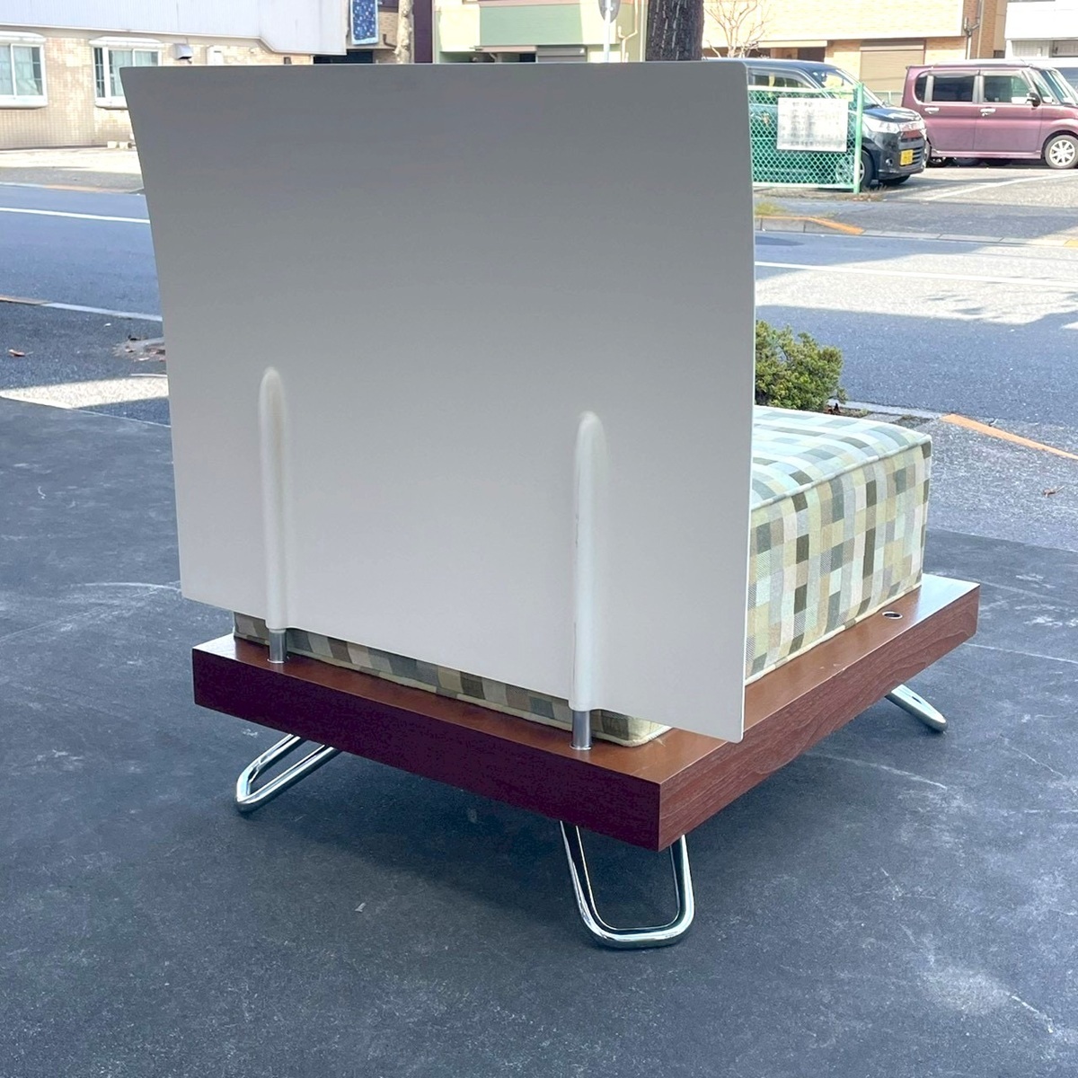 座面下のベースに落ち着いた色味の木製を使用し、モダンなスチール製の脚部がアクセントとなっています。クッションはグリーン系を中心としたモザイクチェック柄になっており、置くだけで空間に明るい印象を与えます。