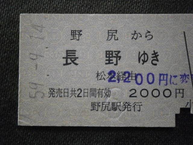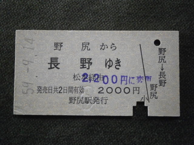 国鉄 野尻駅発行、長野ゆきの乗車券で鵜s。