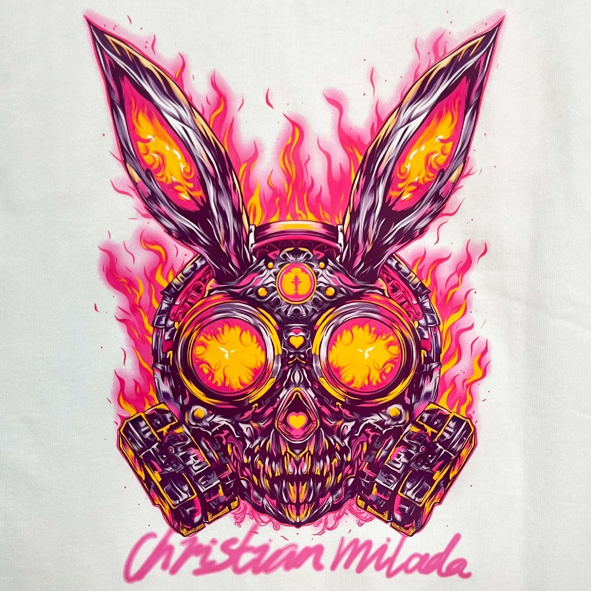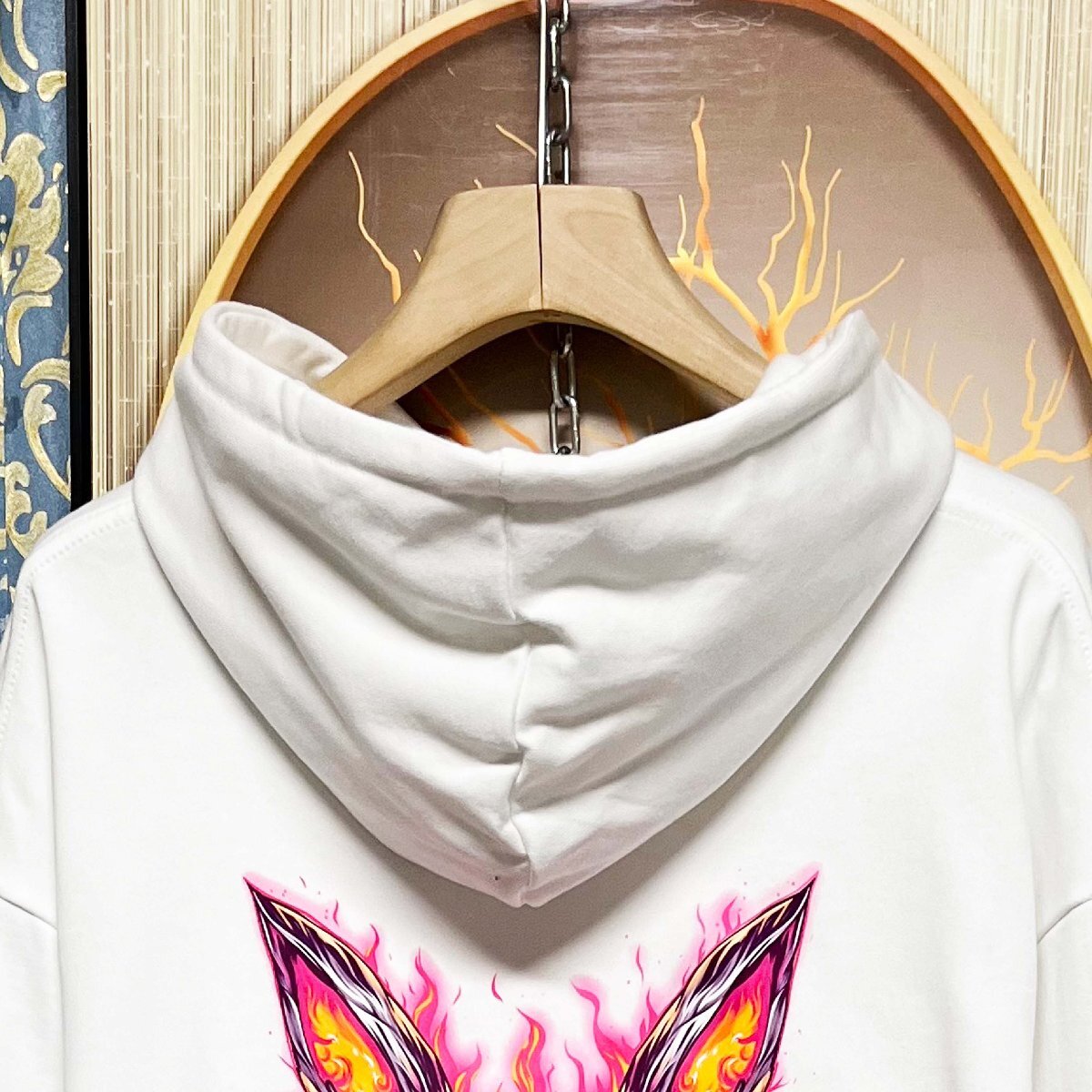 デザイン面では、シンプルな無地のフロントに対し、背面に大胆なサイズで施されたラビットモチーフが目を引きます。程よく個性を演出しつつも、派手すぎず、着る人のスタイルに自然に馴染みます。