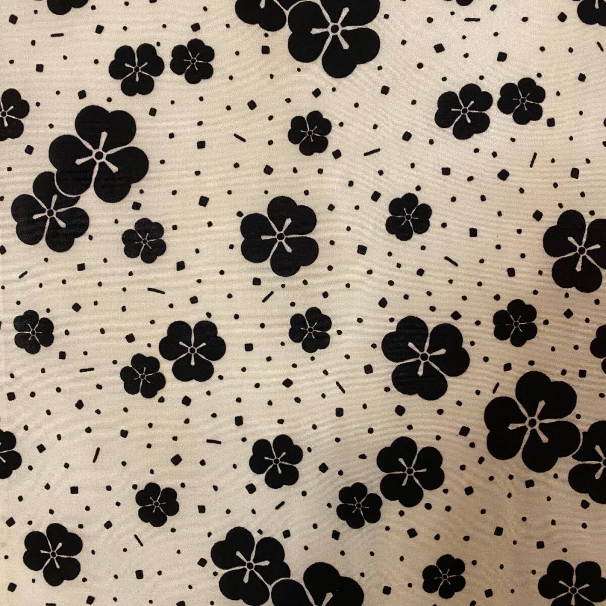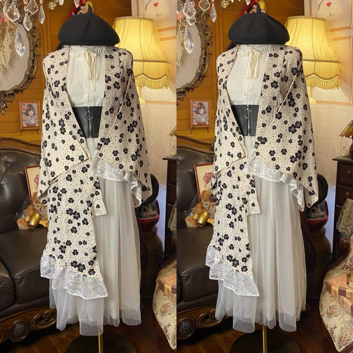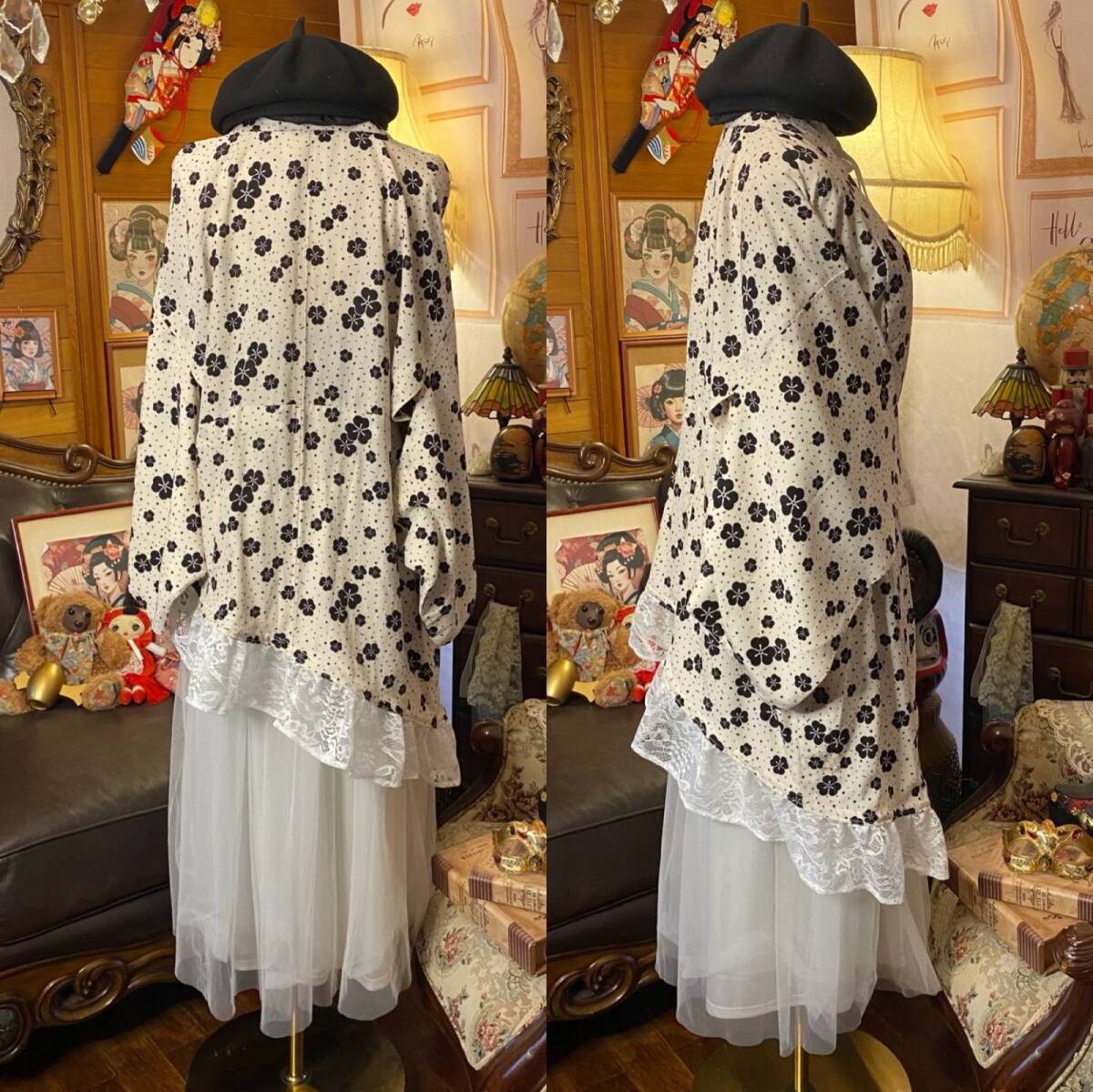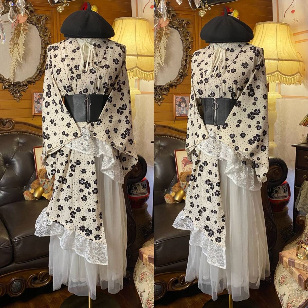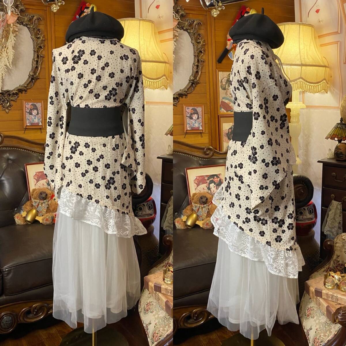 アイボリー地に黒の小花が舞う、繊細でレトロな雰囲気漂う着物をリメイクした、2way仕様のワンピース&ガウン。ふわりと広がる袖と、アシンメトリーにあしらわれたレースが華やかさを引き立て、ガーリーさと大人の品を兼ね備えた一着です。