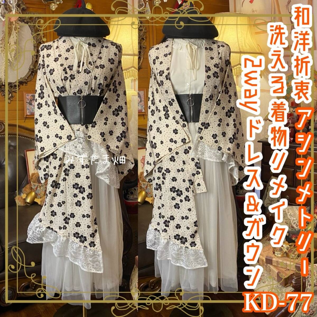 【単衣着物 2way アシンメトリー ガウン 羽織り ドレス ワンピース ハンドメイド 和洋折衷 洗える 化繊 リメイク コルセット太ゴムベルト レトロ 古着 可憐に揺れるモノトーン小花 KD-77】